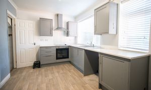 With laminate flooring, kitchen units, integrated oven and hob, sink and tap, two large windows and door to the rear garden.