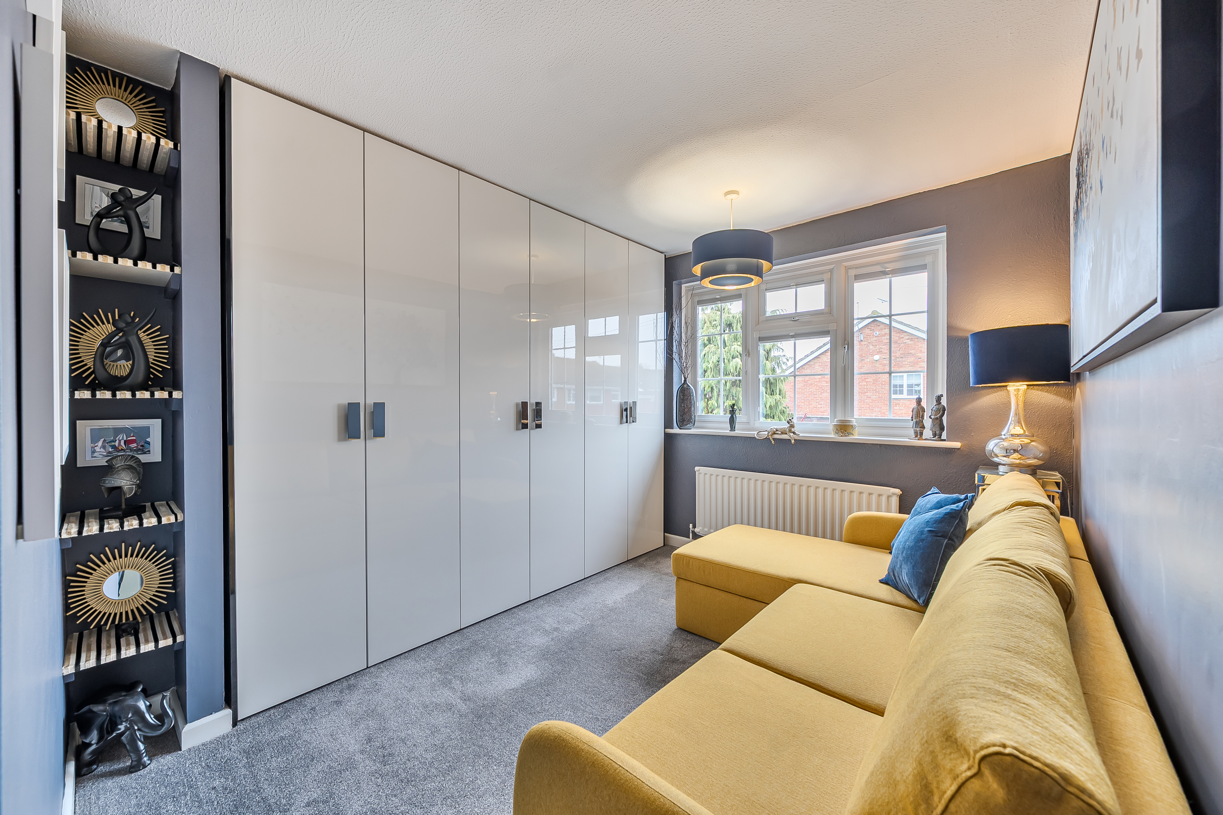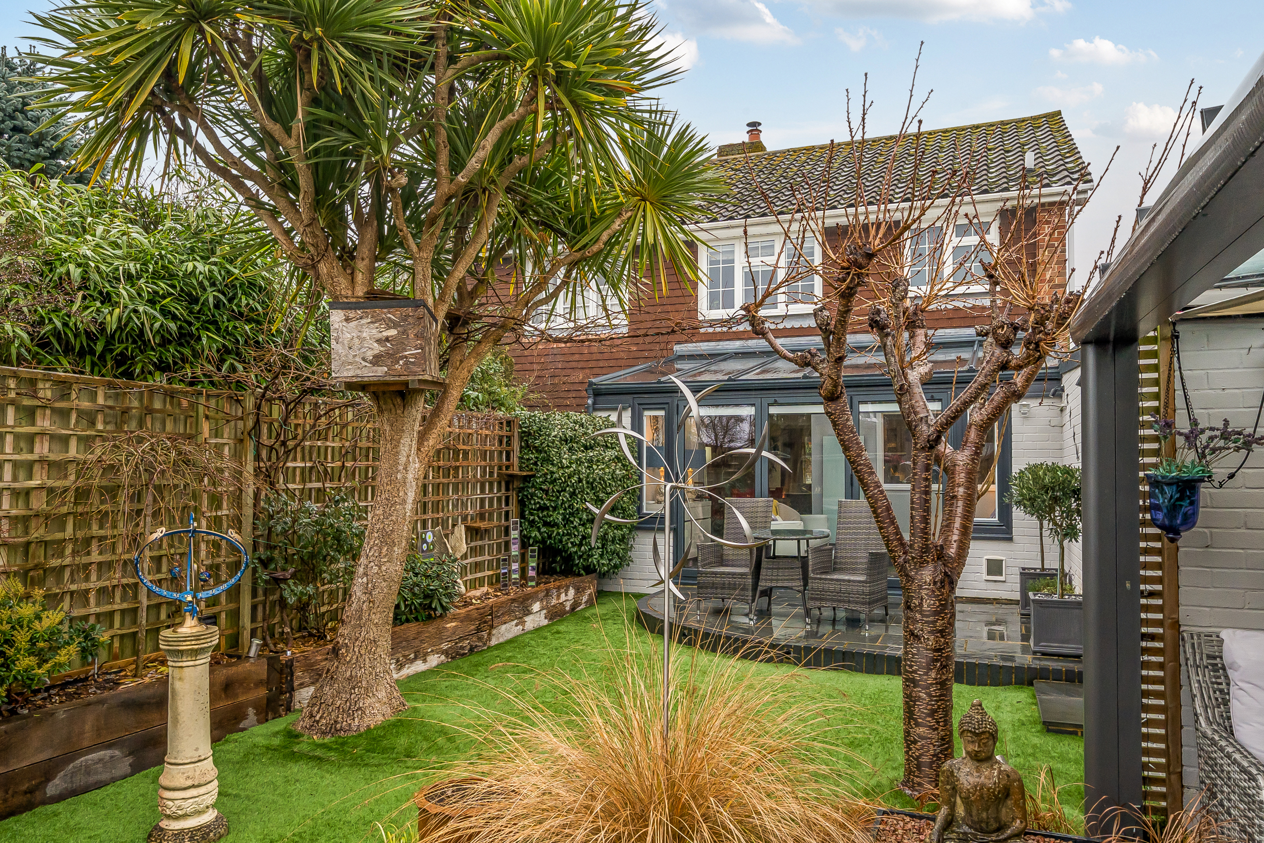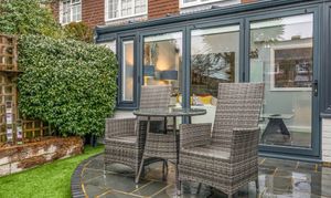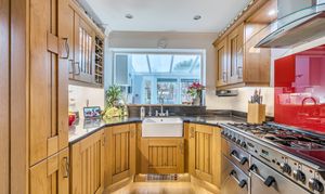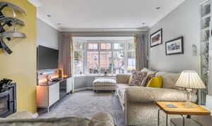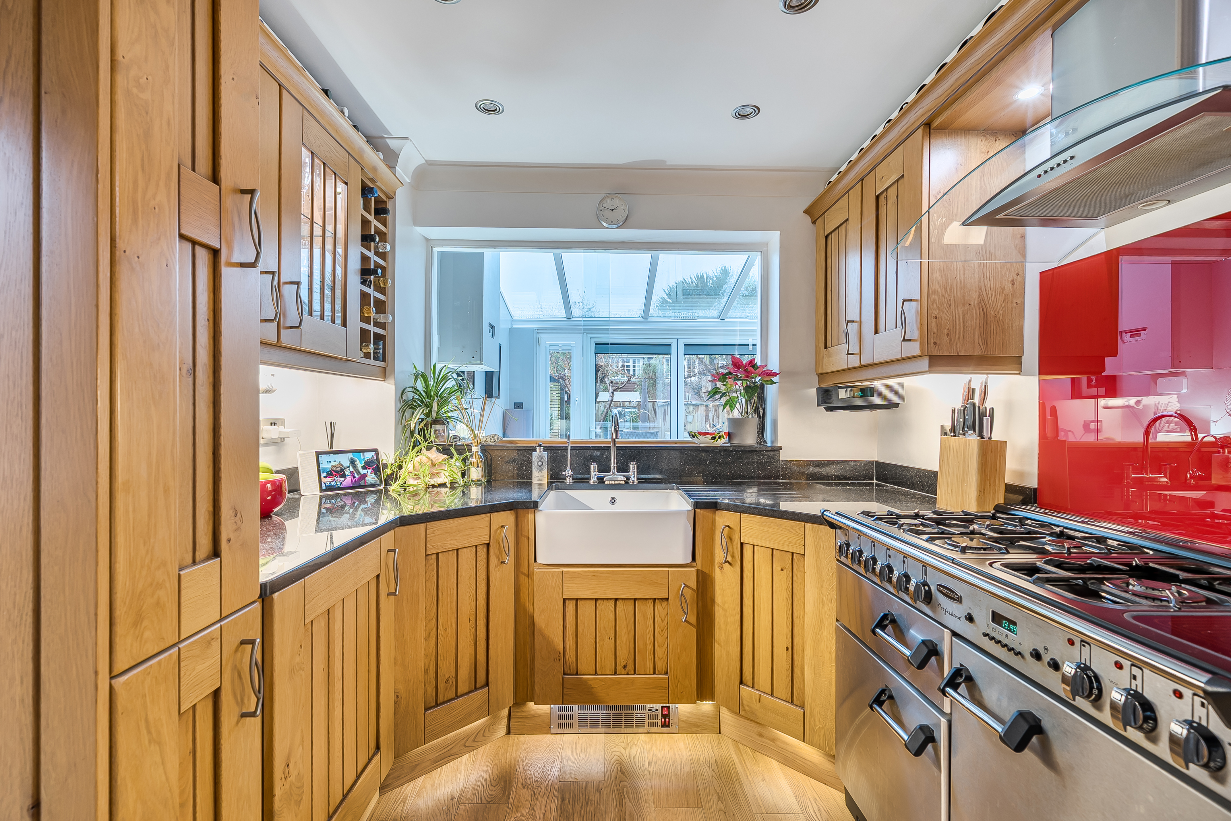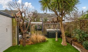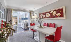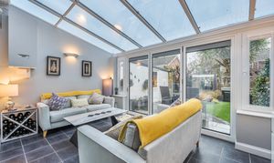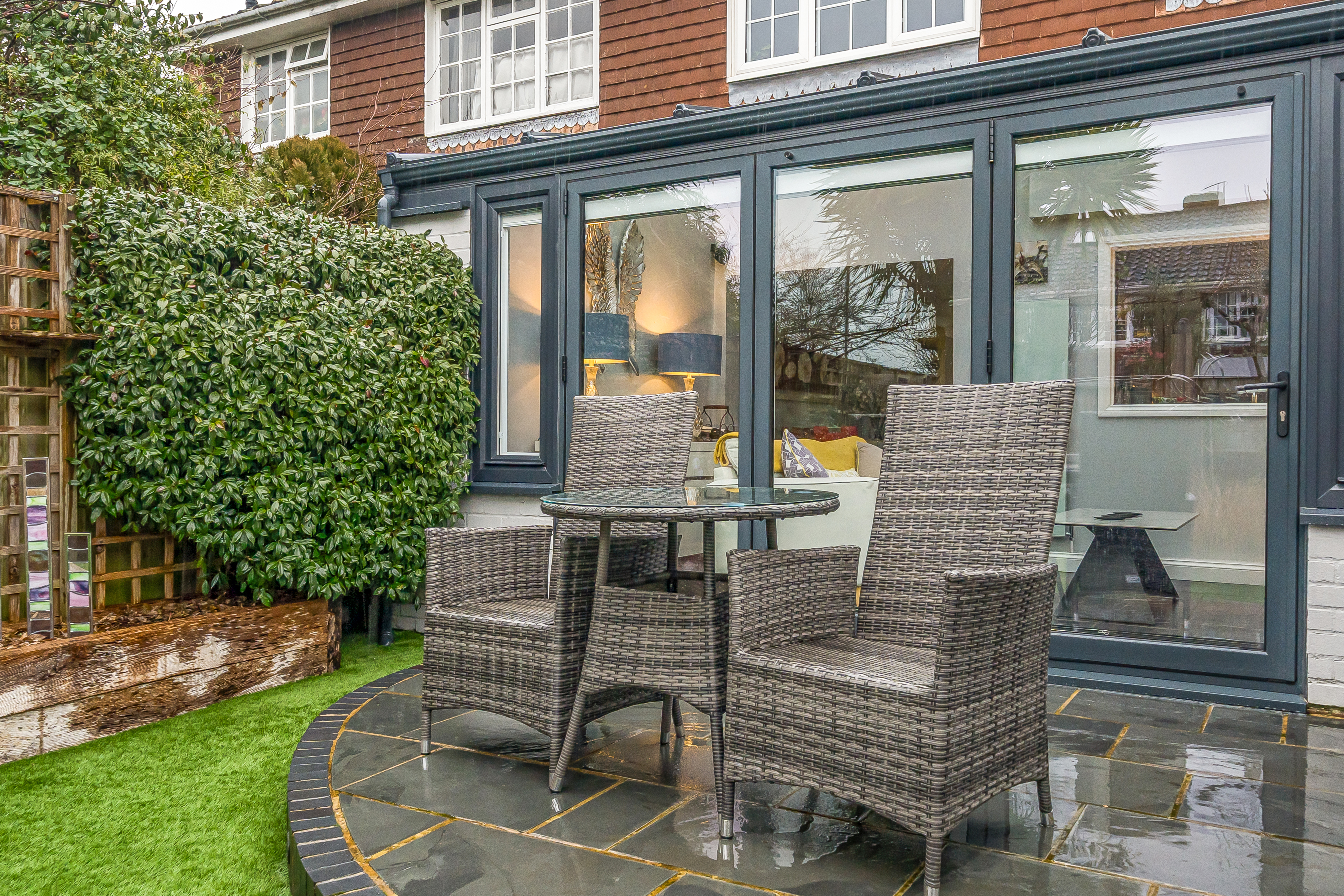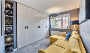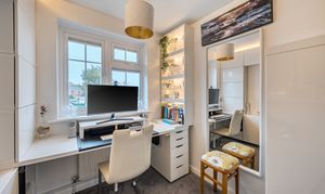 The ground floor opens to a welcoming hallway leading to the living room, which features a charming log-burning stove as a warm and inviting focal point. The bespoke kitchen is fitted with premium cabinetry and integrated appliances, marrying style with practicality, while a garden room to the rear, with reflective glass and underfloor heating, offers a tranquil space that seamlessly connects the interior with the landscaped garden. Upstairs, three generously proportioned bedrooms are served by a contemporary family bathroom, each finished to an exacting standard.