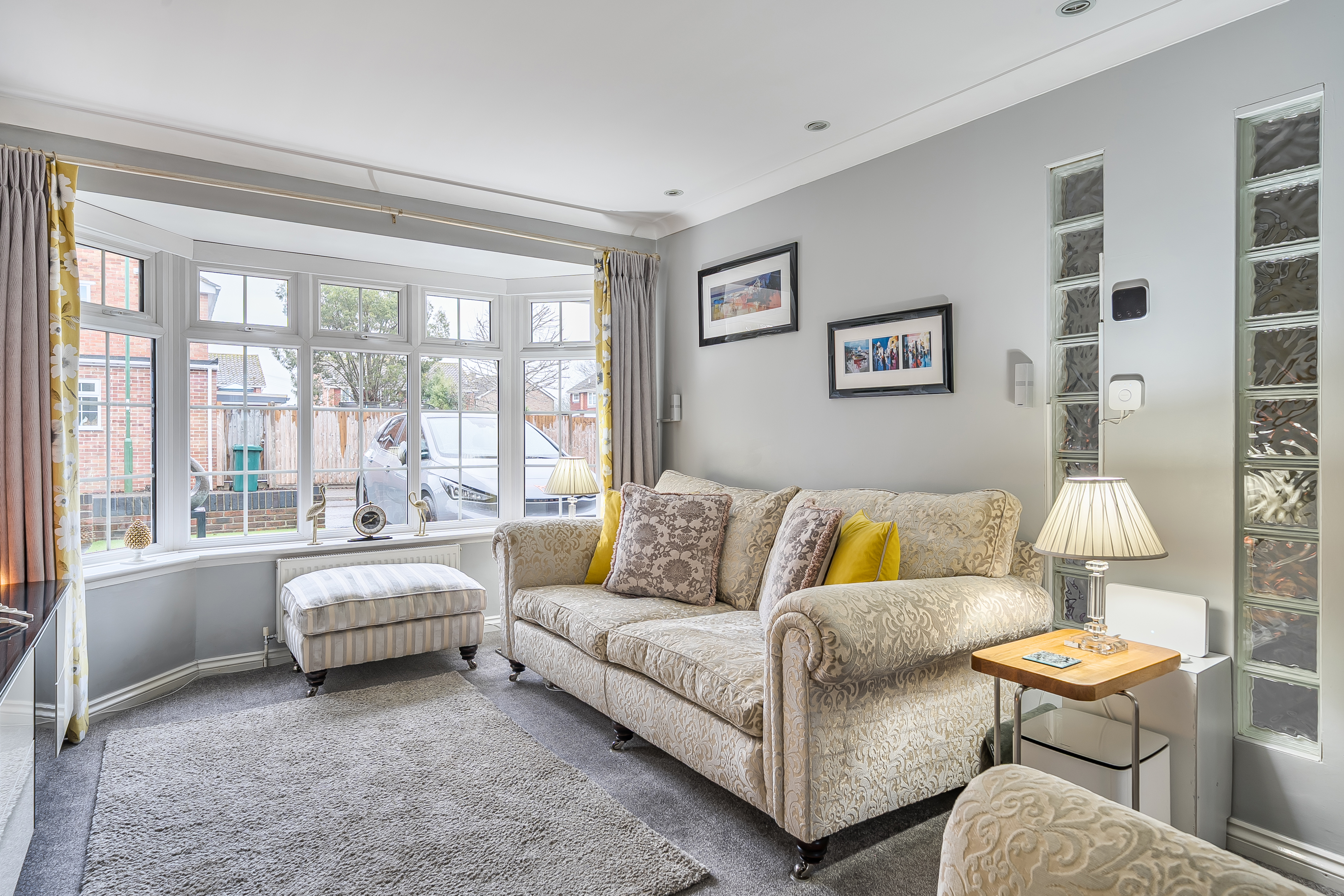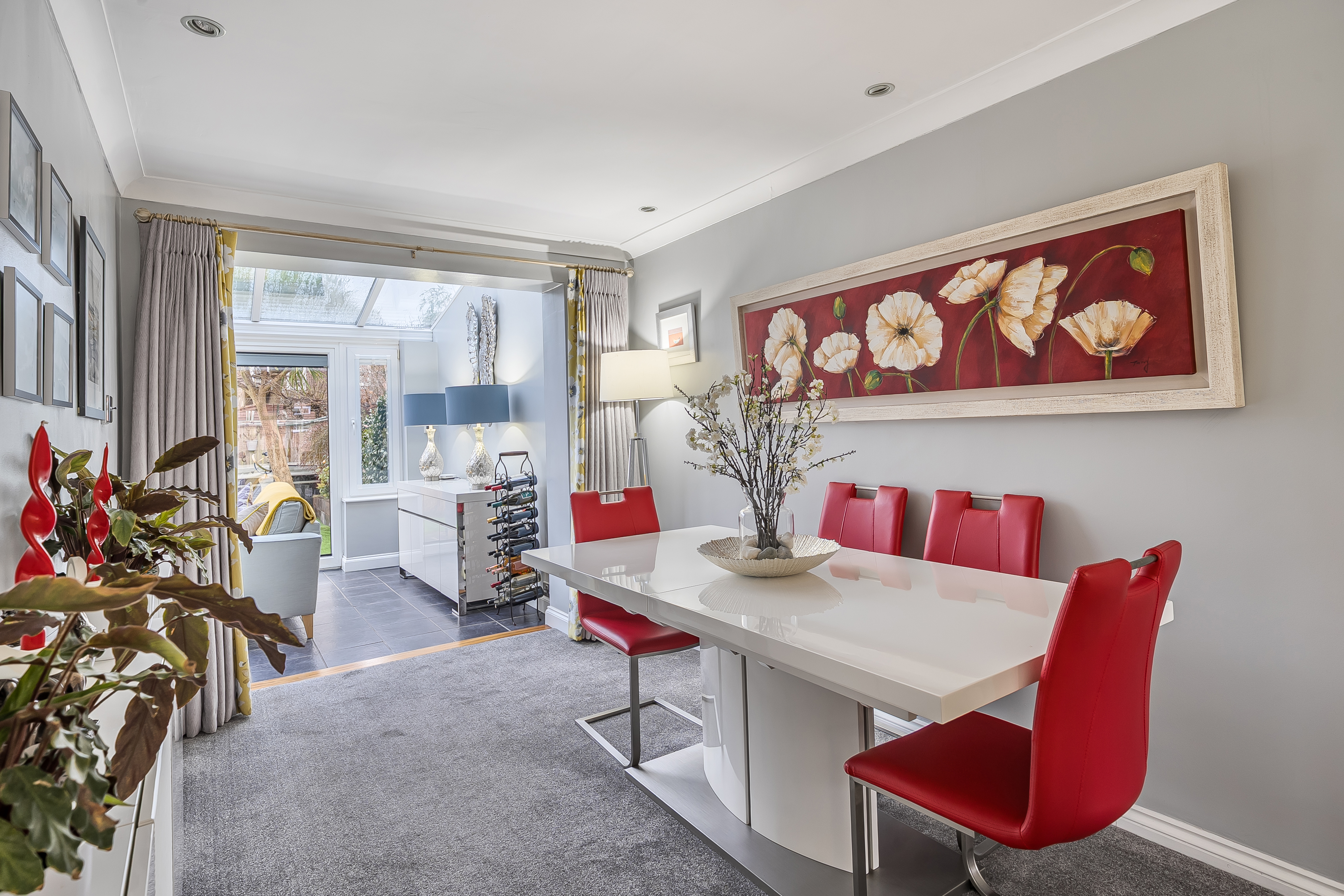 Externally, the rear garden combines lawn and paved areas, with direct access to the detached garage. Beyond the garage, a glazed seating area provides a versatile space for all-year alfresco dining. The front of the property is equally impressive, featuring an EV charging point and outdoor electric sockets, parking for multiple vehicles, and a manicured garden that sets the tone for the home from the very first step.