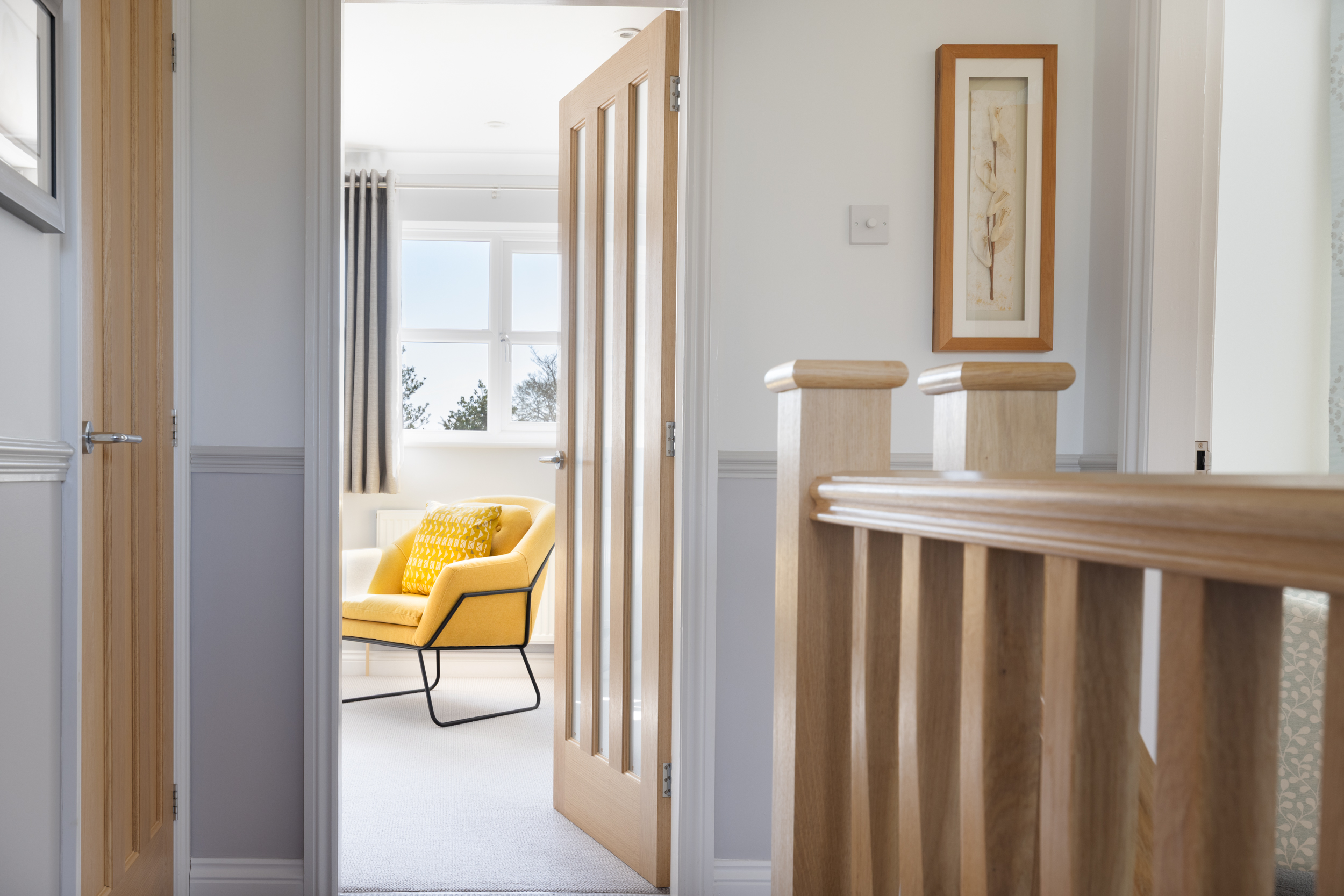 Solid oak doors with toughened glazed panels feature throughout the ground floor, promoting natural light and a cohesive flow between rooms. Warm-toned luxury strip laminate flooring contrasts beautifully with the hand-crafted oak staircase, setting the tone for the sophisticated interiors beyond.