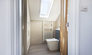 The luxurious family bathroom is a sanctuary in itself - reconfigured to incorporate a large freestanding bath with floor-mounted tap and handheld shower, walk-in digital Mira shower with glass surround, modern basin, low-level WC, and oak display shelf with illuminated mirror above. Two frosted windows dressed with oak sills, allow natural light to filter in, while Porcelanosa tiles, underfloor heating, and a central heated towel rail add comfort and style.