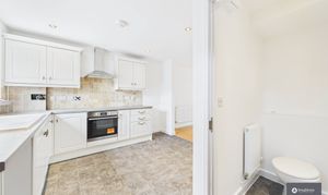 The ground floor features an open-plan kitchen and living area, filled with natural light and finished with wooden flooring to the living space and tile-effect flooring in the kitchen. The kitchen includes a range of wall and base units, tiled splashbacks, extractor fan, and oven, while a glass door opens out to the private rear garden. A downstairs W.C. adds convenience to everyday living.