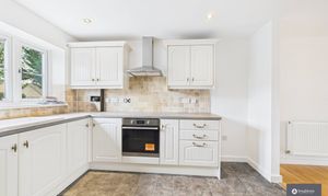 - Kitchen with wall and base units, extractor fan, oven, and tiled splashbacks