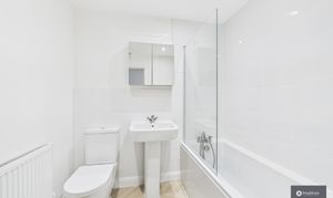 Upstairs are two double bedrooms, including a generous main bedroom with a walk-in wardrobe cupboard. The modern family bathroom has been recently updated and features a W.C., sink, shower over bath, sleek flooring, partial wall tiling, and a mirrored storage cupboard.