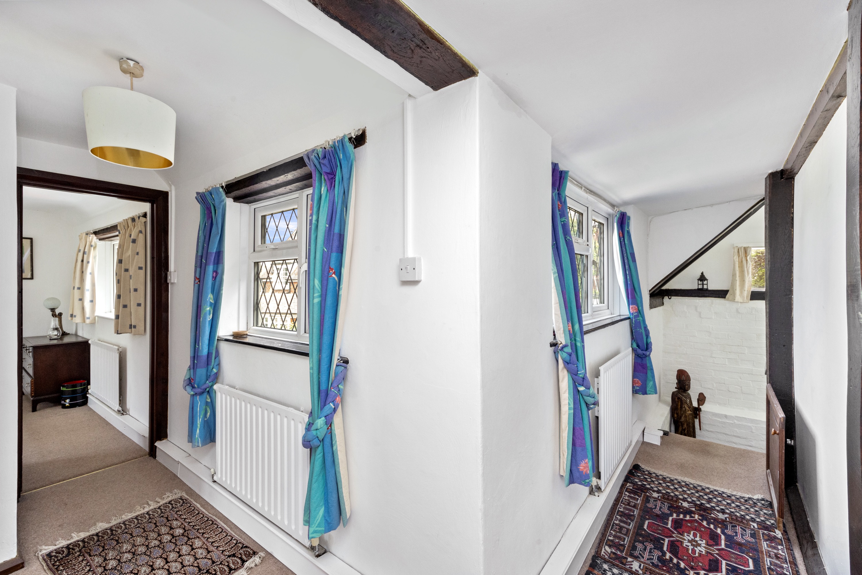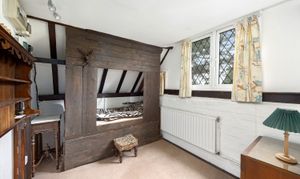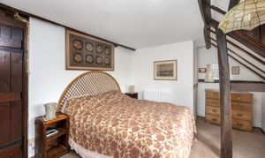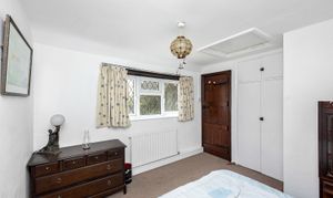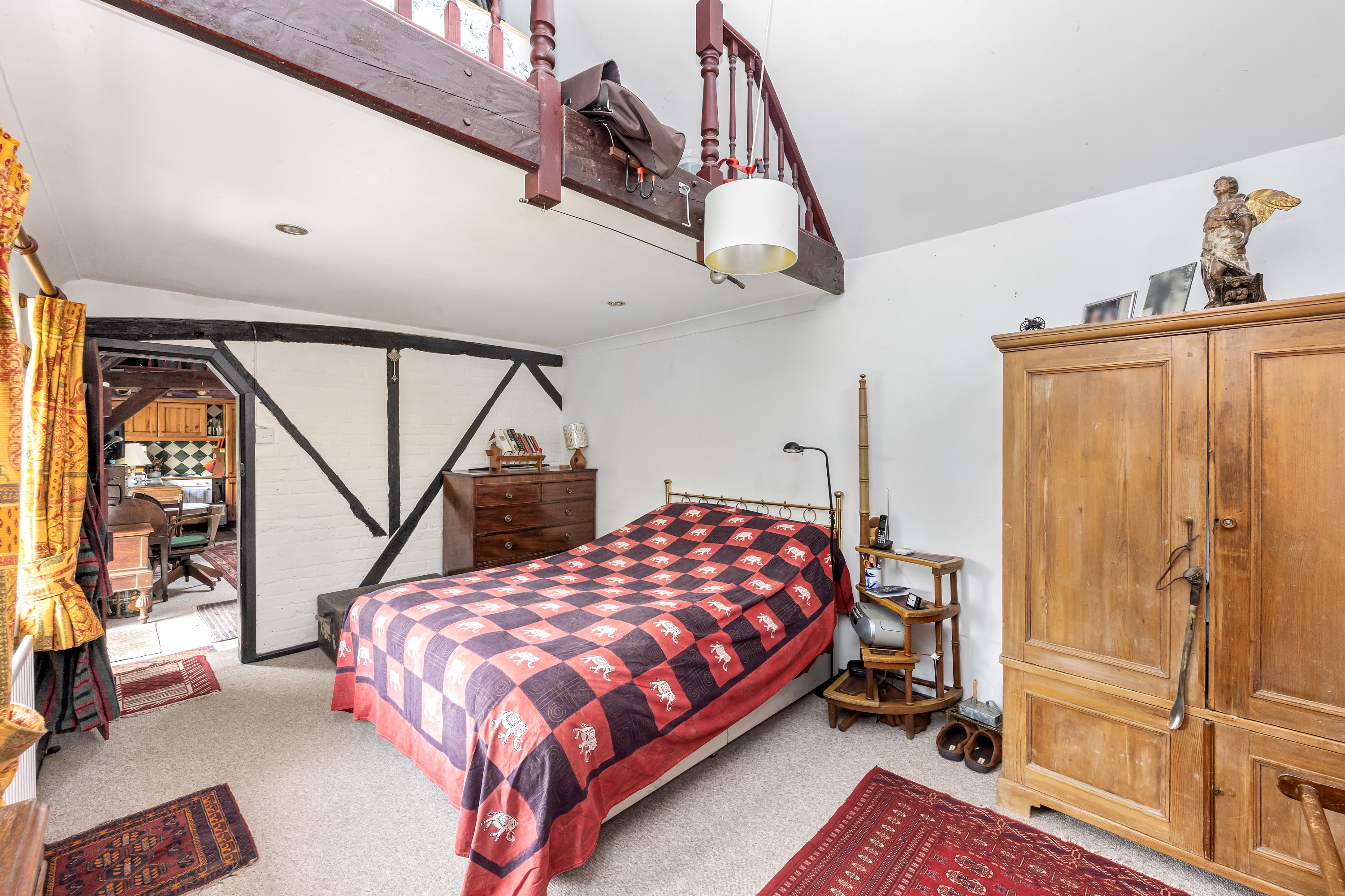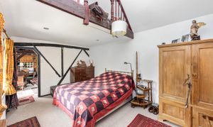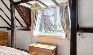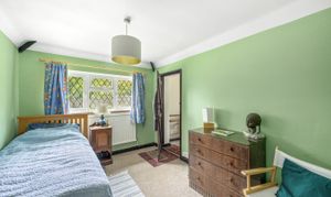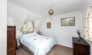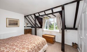 First door on the left is to the principal bedroom, a large double with part-vaulted ceiling and exposed beams. Fitted wardrobes line one wall, and a uPVC double-glazed window offers partial views of the South Downs.