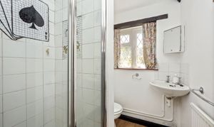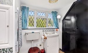 White suite comprising of low level w/c, basin, bath with shower head and towel radiator. An airing cupboard houses a hot water tank and ‘Glow Worm’ gas boiler, installed for central heating and hot water in 2023.
