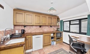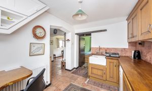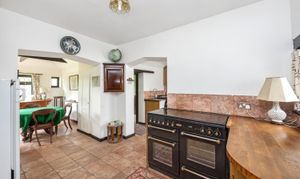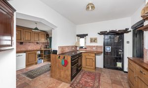 Country-style kitchen separated into three areas: two linked kitchen spaces and a breakfast room, all with fully tiled floor. The kitchen areas have custom-built, wall-mounted and base-level solid wood cupboards with solid wood countertops. Appliances include a freestanding Rangemaster 5-ring hob/oven, freestanding dishwasher, washing machine, fridge freezer and ceramic butler sink. The Breakfast room comfortably seats six and has uPVC double-glazed windows with views into the rear garden.