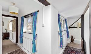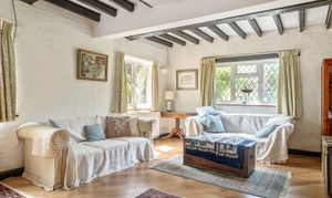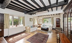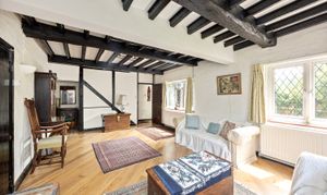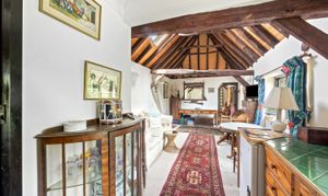 Large, dual aspect room with views into the gardens, exposed ceiling beams, uPVC double-glazed windows and understairs storage niche.