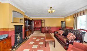 The dining room adjacent is a large and bright space, enjoying a window to a side aspect, carpets, pendant lighting and room for a large dining setting and storage furniture. The lounge is equally incredibly spacious, benefiting from a window and double sliding doors to a dual aspect, a fireplace, sconce and pendant lighting, and ample space for a variety of lounge and storage furniture.