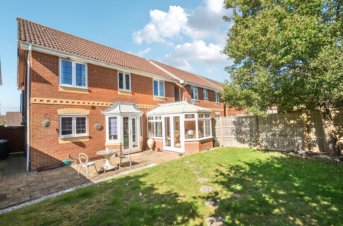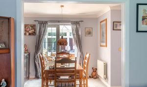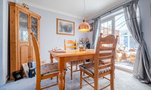 Inside, the property opens to a spacious entrance hall with cloakroom. The open-plan sitting and dining room is bright and airy, with French doors leading into a conservatory that overlooks the garden. The well-proportioned kitchen/breakfast room is fitted with shaker-style cupboards, a breakfast bar, integrated dishwasher, electric oven, gas hob and cooker hood. A utility cupboard provides plumbing for a washing machine and French doors from the breakfast area open directly to the rear garden.