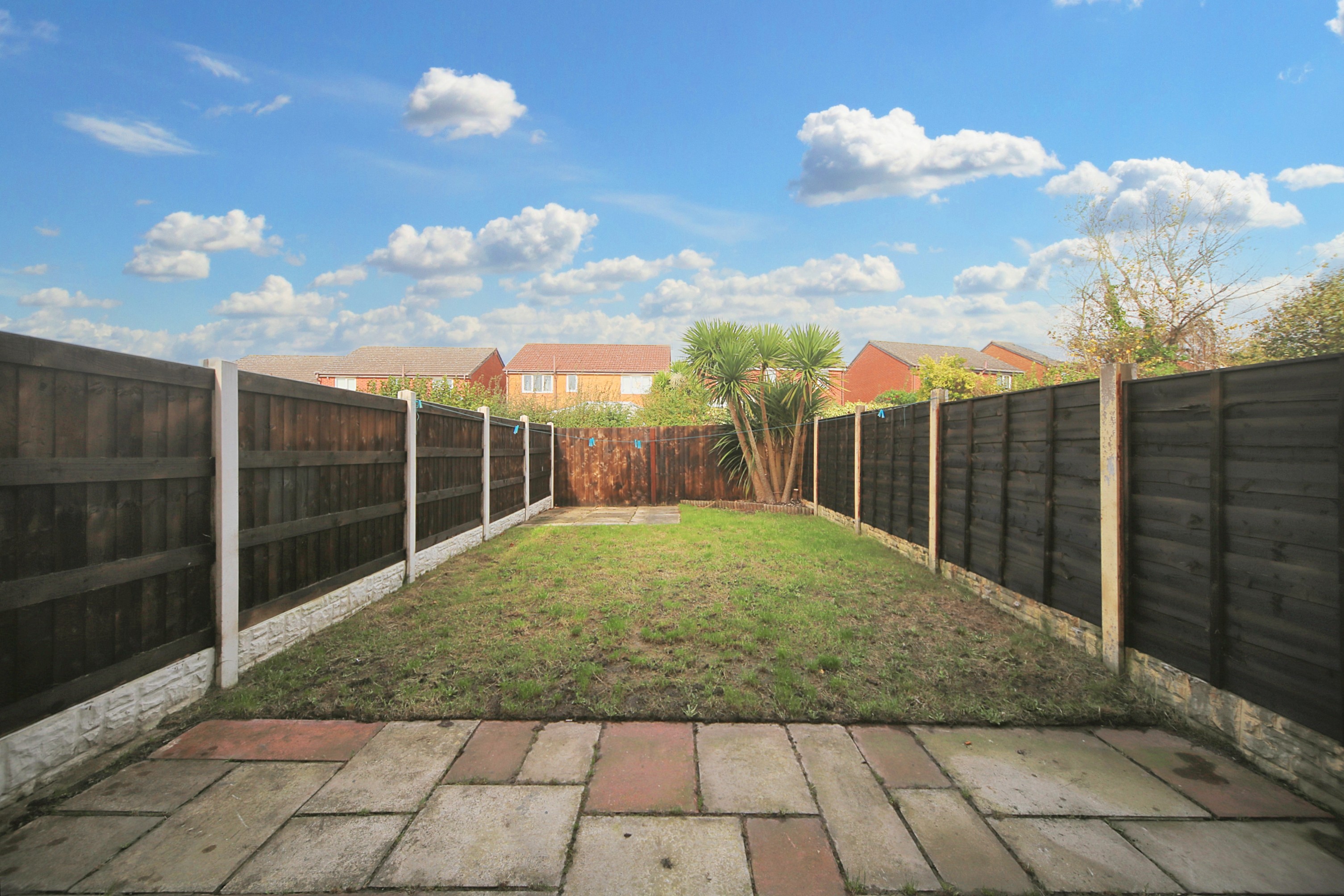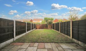 - Rear garden with patio and lawn with side gate access