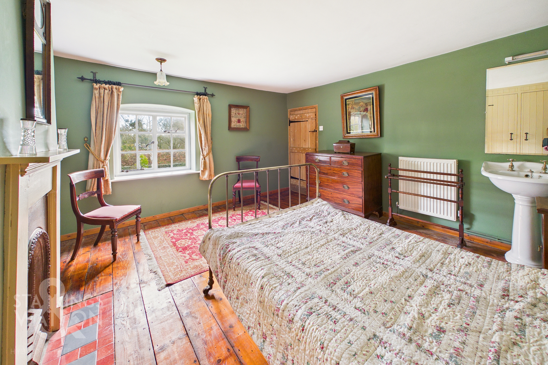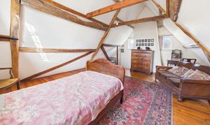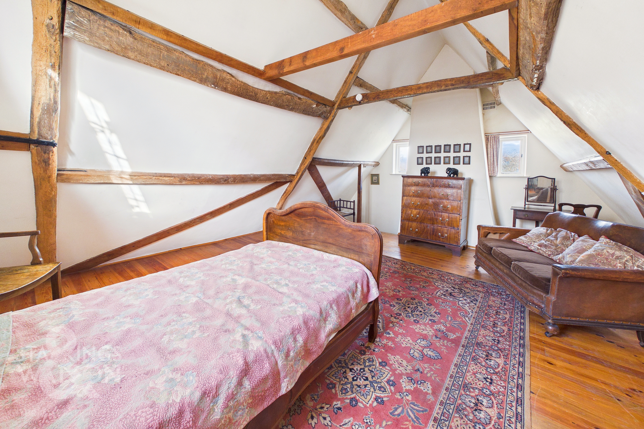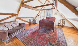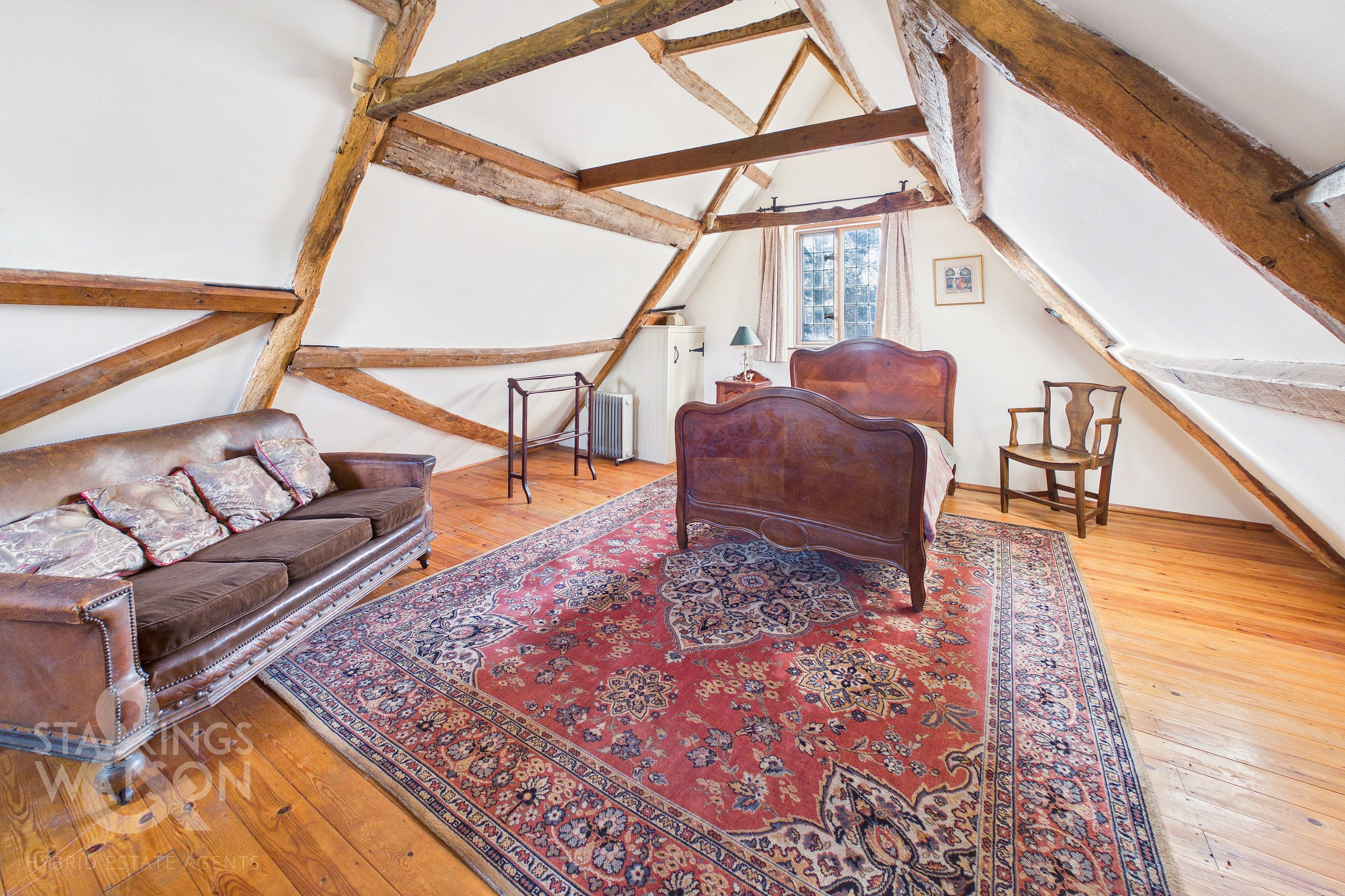 From the landing, a feature fireplace is tucked away to one side with a door concealing storage and stairs to the top floor. The top floor offers a further double bedroom sitting under a vaulted ceiling with exposed timber beams, with a front facing window and twin rear facing windows offering extra natural light, with stripped wood flooring underfoot.