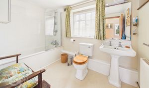 Heading upstairs, the landing offers an attractive stripped wood flooring underfoot, with a split level landing leading to the bedrooms and family bathroom. As you approach the first floor, the first of the double bedroom sits to your left hand side, centred on a feature fireplace with stripped wood floor underfoot, front facing window and built-in double wardrobe. Sitting opposite, the family bathroom includes a three piece suite, with a mixer shower tap and thermostatically controlled shower with glazed shower screen over the bath, tiled splash-backs and rear facing window. A further double bedroom follows around the landing with stripped wood floor underfoot, rear facing window and built-in double wardrobe. The main bedroom sits to the front of the property finished in a similar style with twin front and side facing windows, stripped wood flooring and timber beams to the ceiling.