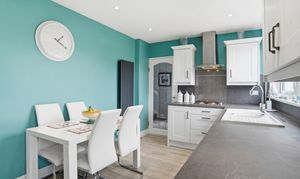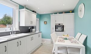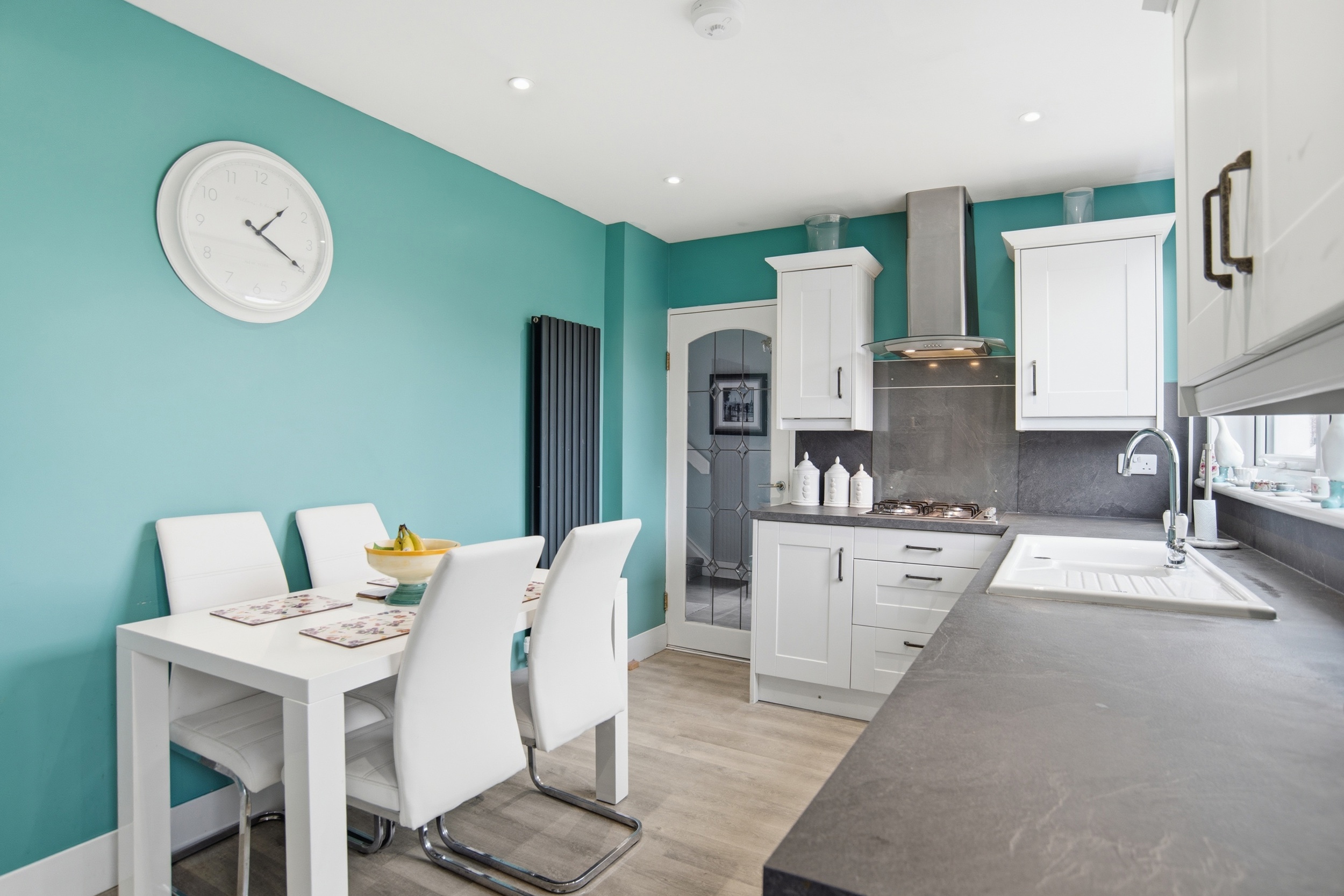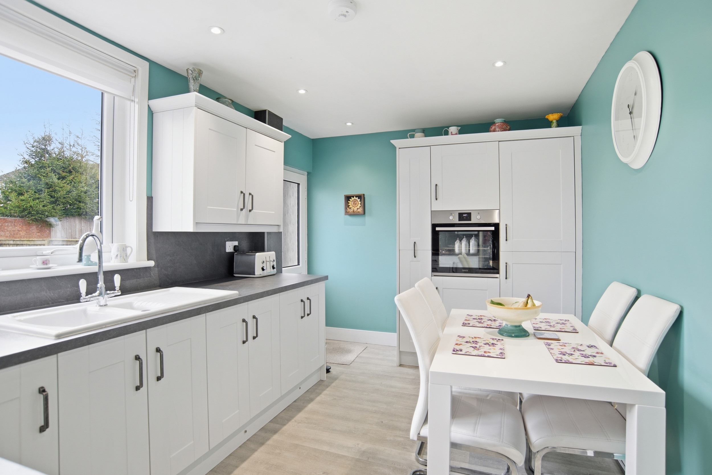 To the rear of the home is the open plan kitchen and dining area, which has been renovated and offers excellent space for everyday living and hosting. The kitchen is fitted with white matte cabinetry, generous worktop space and splashback tiling. It features a four point gas hob, integrated oven, integrated fridge freezer and space for additional white goods. There is ample room for a dining table for around four people, while rear facing windows allow natural light to fill the space.