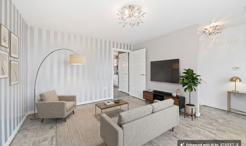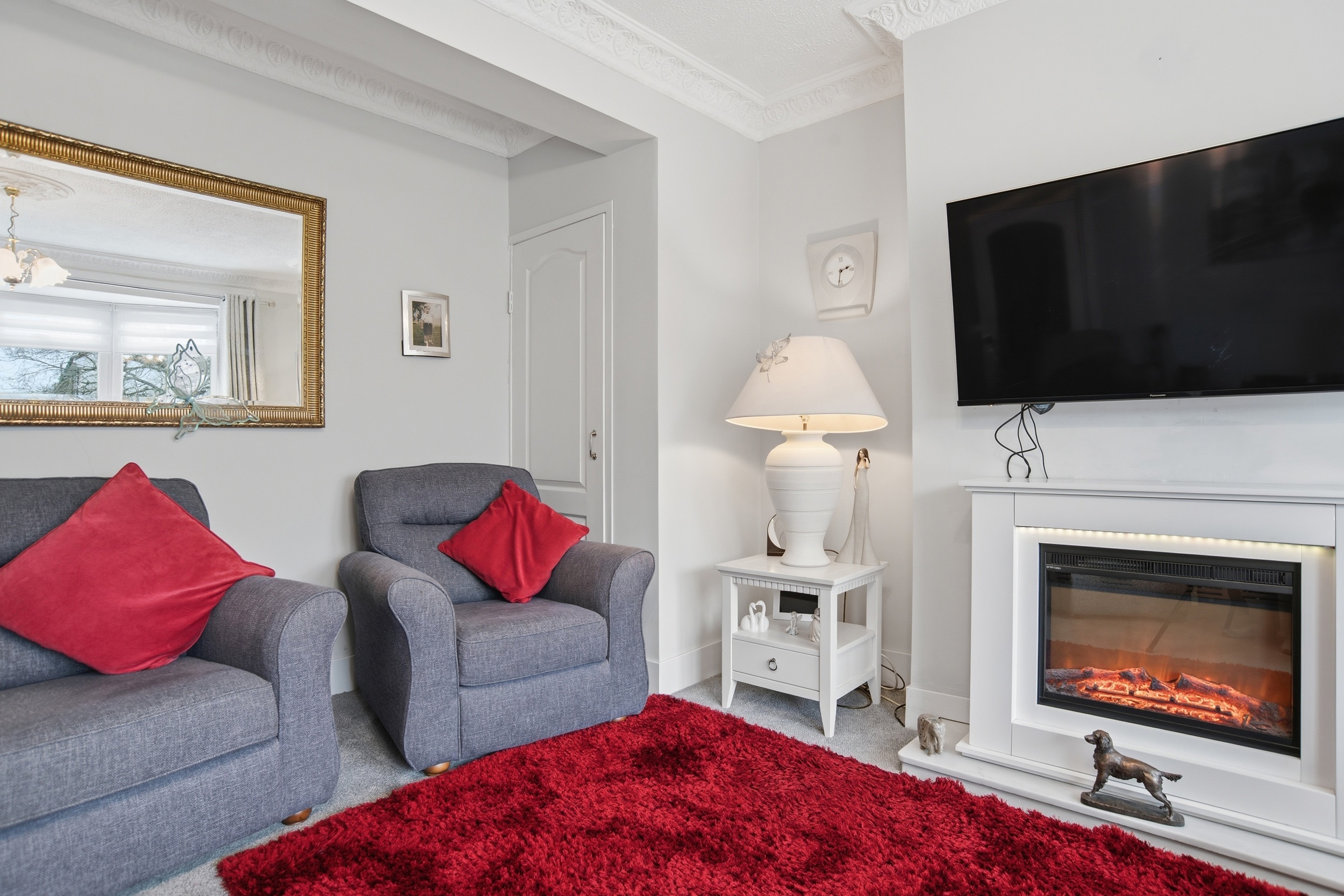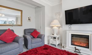 Upon entering, you are welcomed into a bright and spacious hallway with useful storage positioned underneath the stairs. To the right hand side, at the front of the property, sits the lounge, a cosy and inviting space that comfortably accommodates two large sofas along with a media wall. A fireplace creates a focal point for the room, making it an ideal space for relaxing in the evenings.