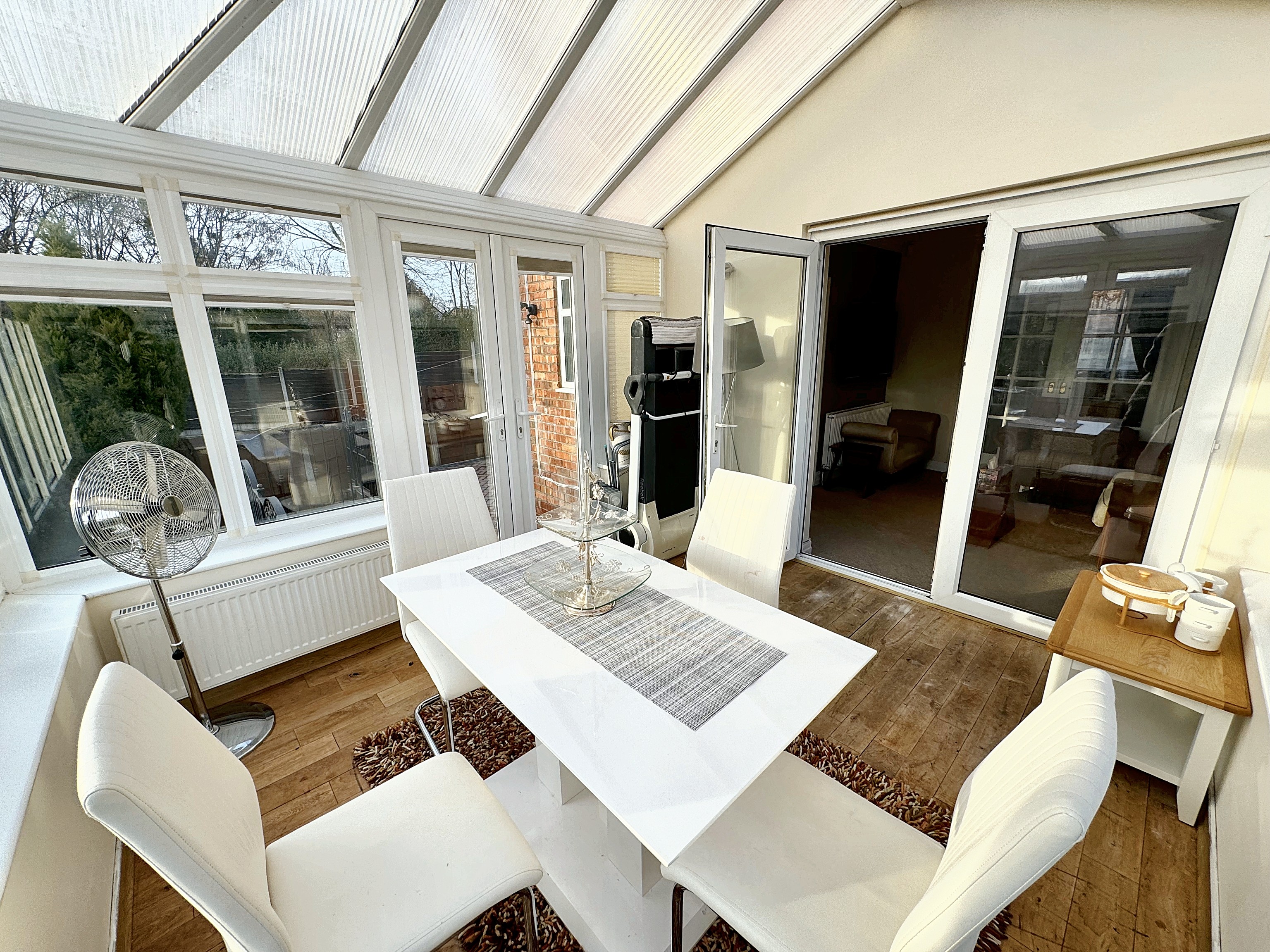 Upon entering, you are greeted by a warm and inviting atmosphere. The spacious living room provides an ideal setting for relaxation and entertaining, with its abundance of natural light and a cozy fireplace that serves as the centerpiece of the room. The open floor plan seamlessly connects to the conservatory dining space, allowing for effortless flow and interaction among family and friends. Patio doors open out to the patio and generous garden, surrounding with mature trees and shrubs and patio area.