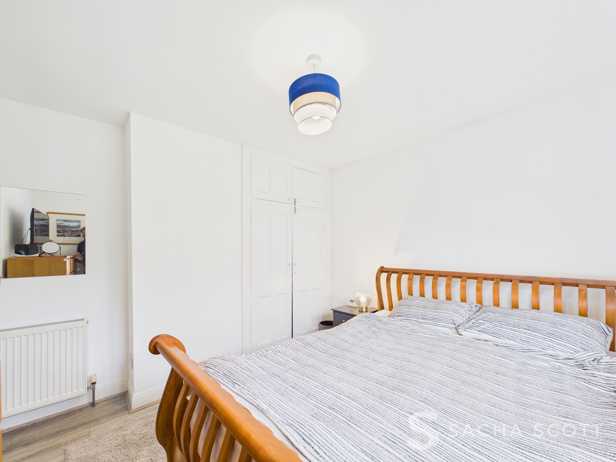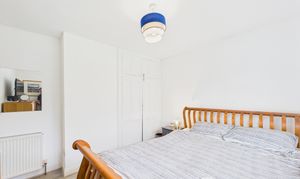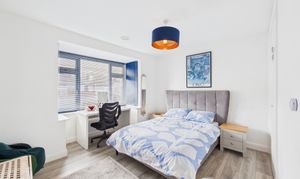 The primary bedroom benefits from neutral decor, warm wood effect laminate flooring and built in wardrobes. Bright and spacious, the bedroom benefits from a large bay window overlooking the front driveway.
