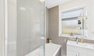 Modern and bright, the bathroom is part-tiled and offers a modern combination sink and WC unit with storage, a heated towel rail and a shower over the bath with screen.