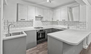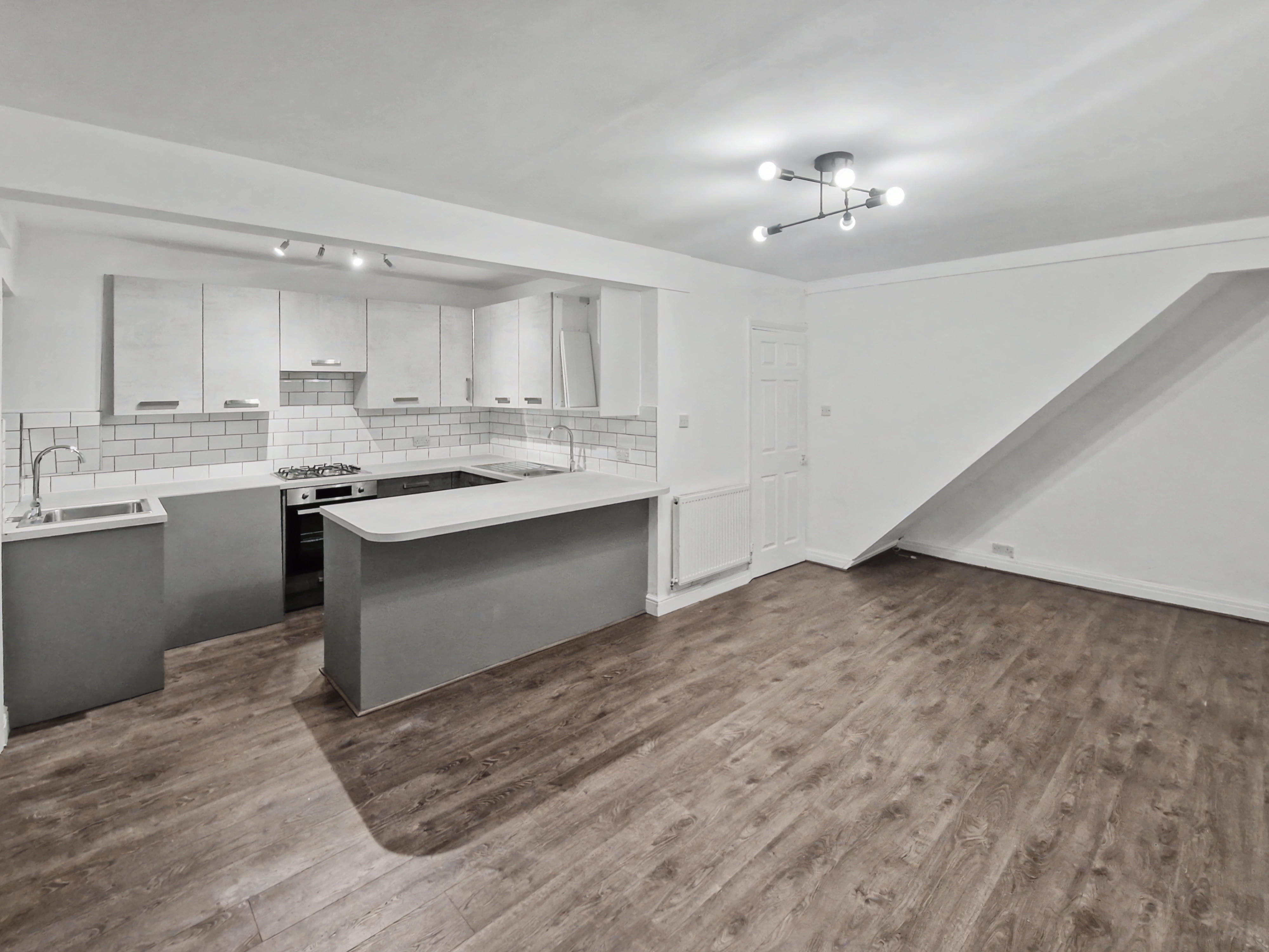 The kitchen has been newly fitted and finished in a contemporary style, featuring modern grey units with chrome-effect handles and stylish white tiling. Space is provided for a washing machine and fridge. Leading off the kitchen is a small utility and storage area which also houses the combination boiler.
