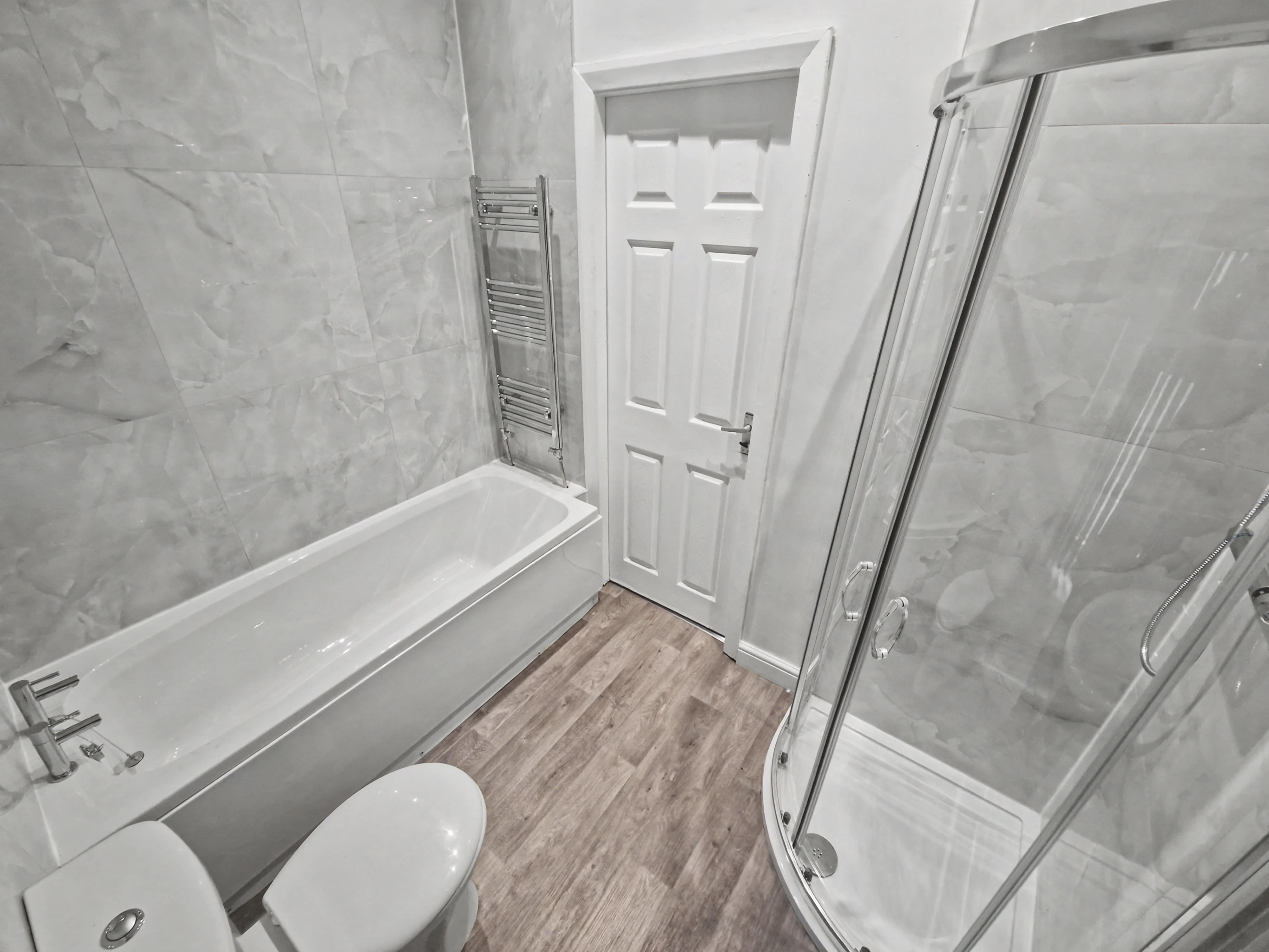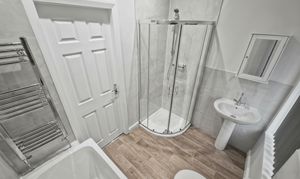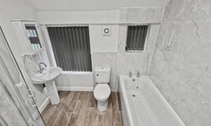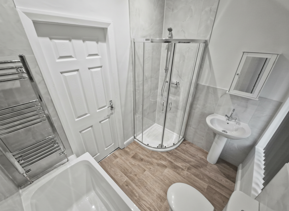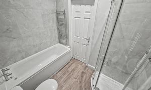 To the first floor, the landing provides access to four bedrooms. The master bedroom overlooks the rear garden and offers a well-proportioned double room, with a second double bedroom adjacent. The newly installed family bathroom features a modern four-piece suite comprising a bath, WC, wash basin, and separate shower cubicle, finished with attractive marble-effect tiling.