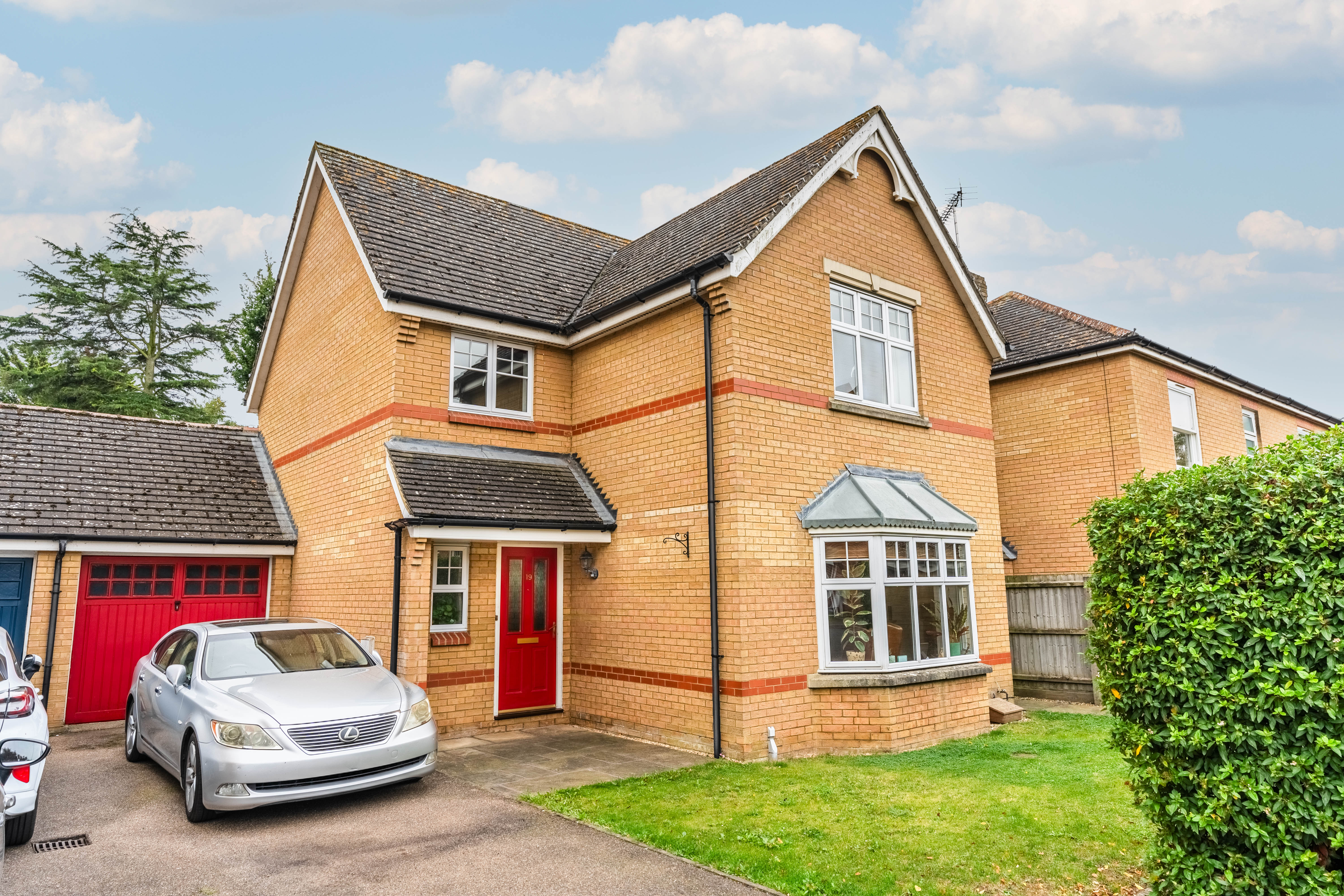 To the side of the property is a driveway providing off-road parking for two vehicles, leading to a single brick-built garage with overhead storage.
