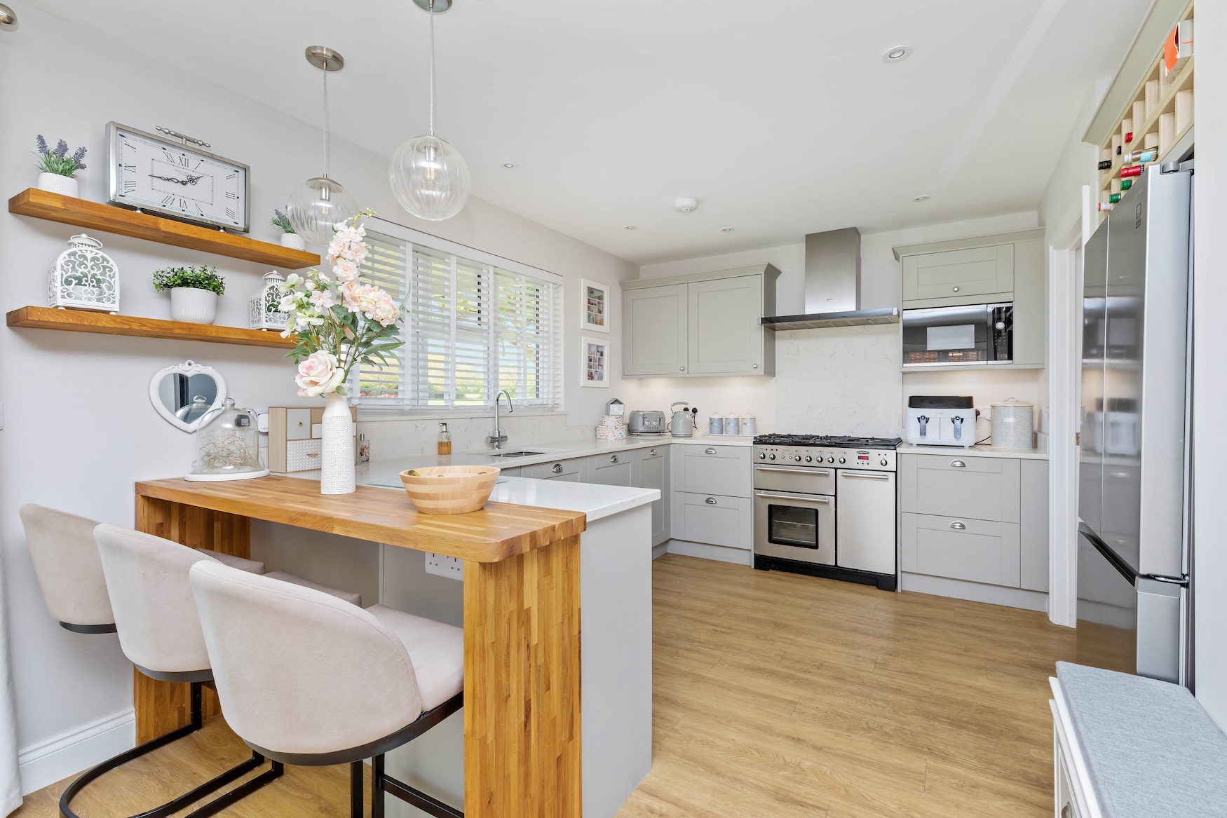 The kitchen is fitted with an attractive range of units, Quartz work surfaces, integrated dishwasher and space for gas range cooker and American fridge freezer.
