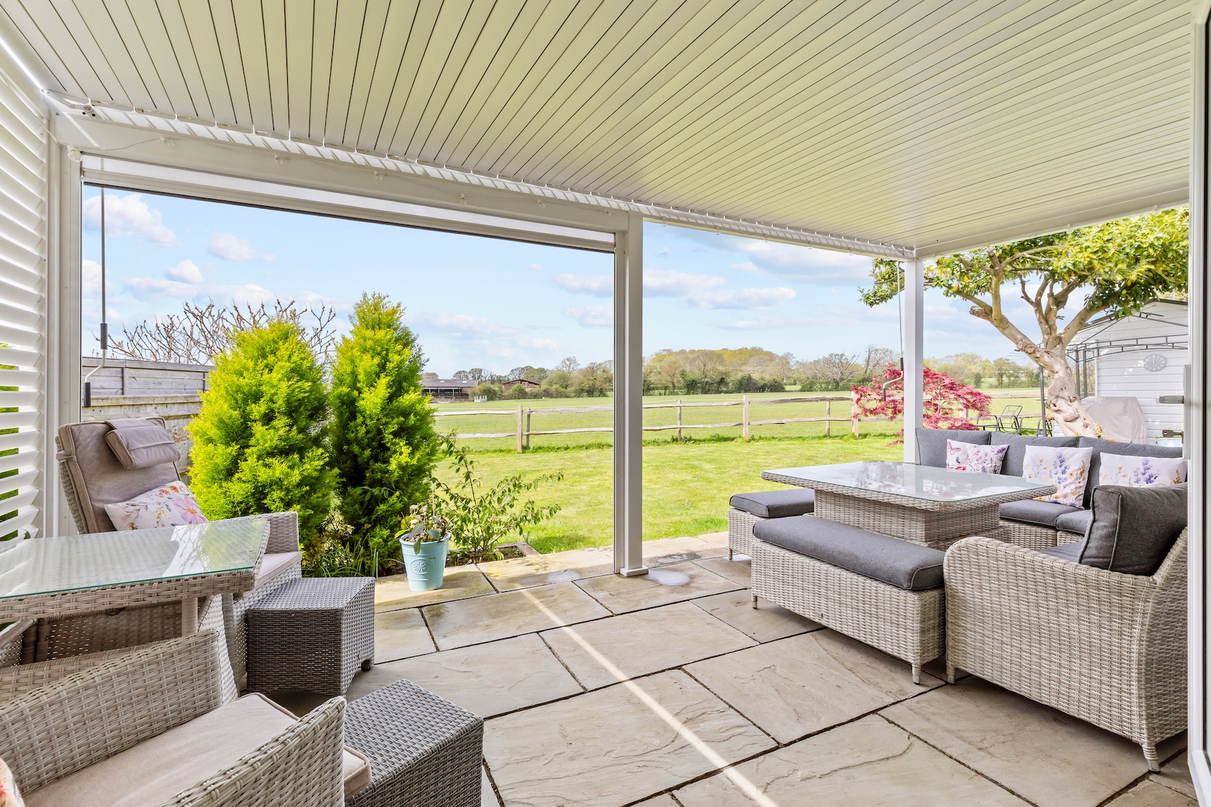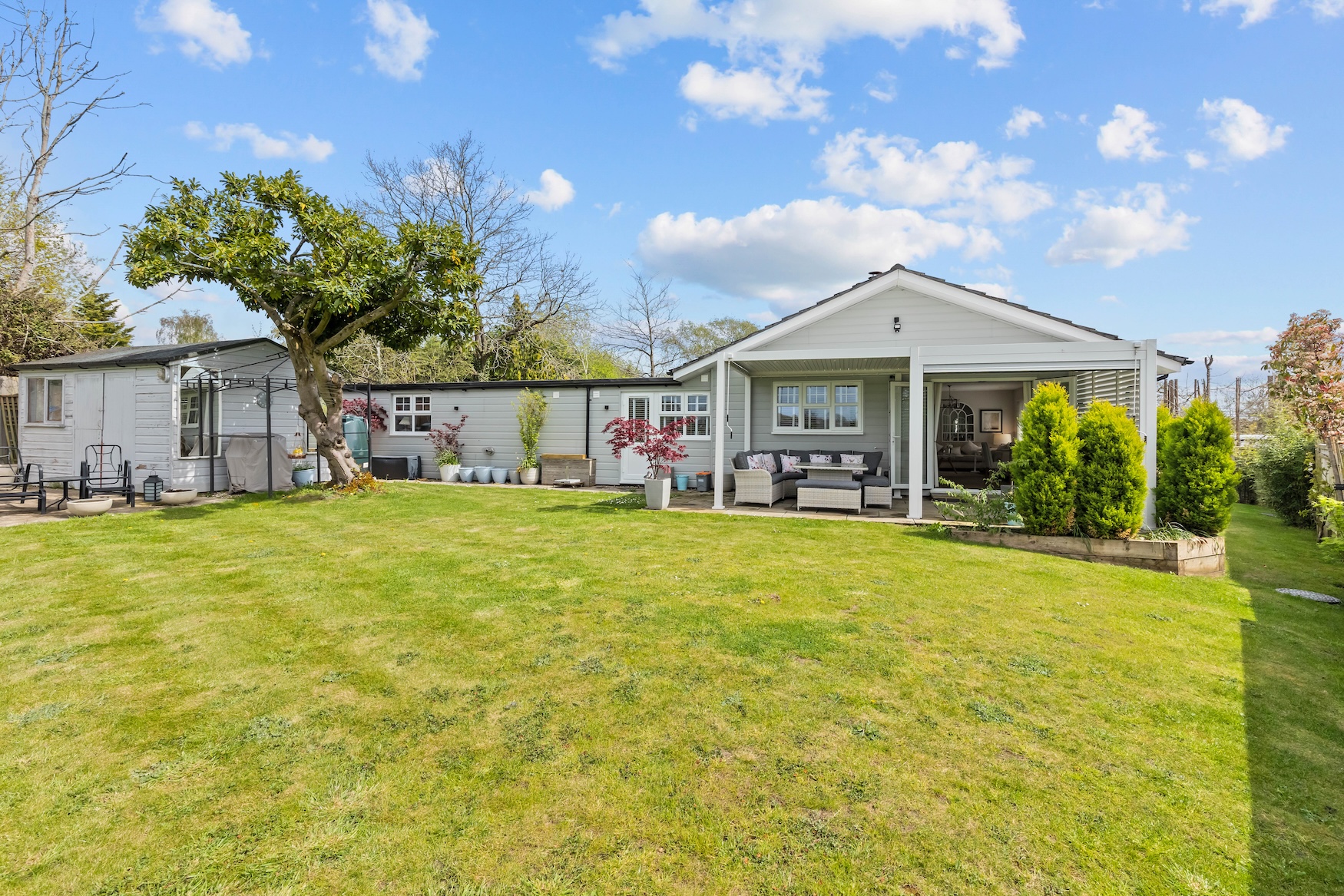 The rear garden is predominantly lawned with paved patio and newly installed pergola with Louvre roof, sun blind and lighting.