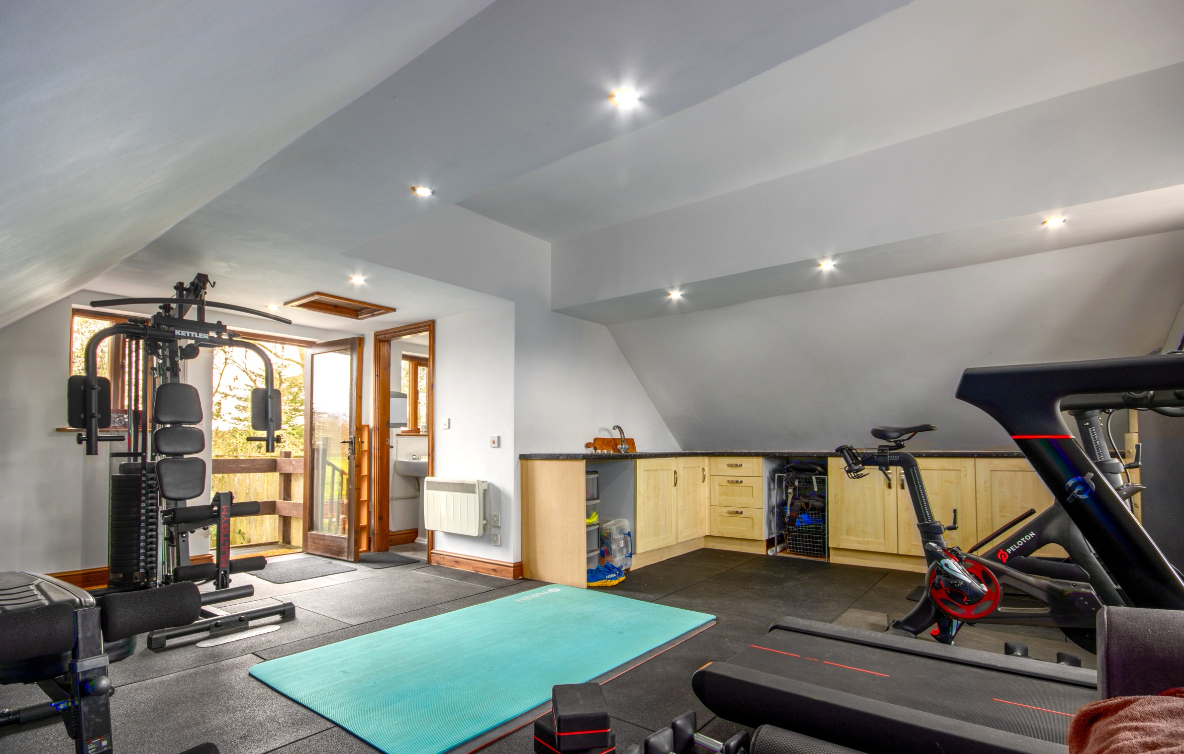 Separate to the house is a large double garage building, where the first floor has been converted into a useful studio annex with a kitchen units and work surface and a separate shower room with WC, sink, shower and plumbing for a washing machine. It does double up either as a fantastic home office or indeed in its current form a gymnasium.