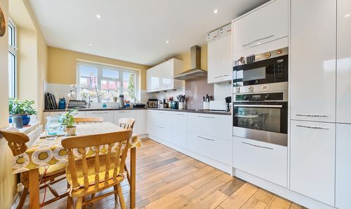 Bright double aspect room with double glazed side access door to garden and windows to rear and to side, space for dining table and chairs, fitted units at eye and base level with worktops, inset sink, inset hob with fitted hood over, inbuilt oven and microwave oven, integral dishwasher and fridge freezer.