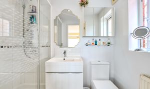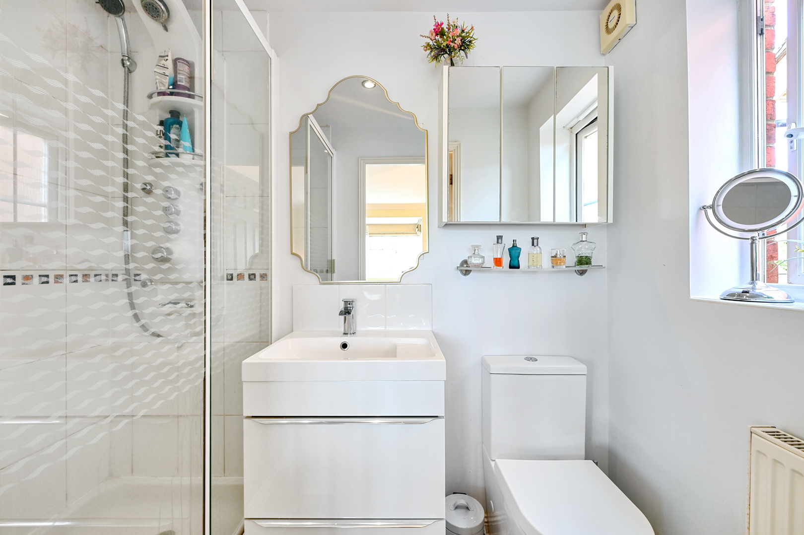 The master en-suite is fitted with a corner shower enclosure, a modern vanity unit with inset basin, and a close-coupled WC. A frosted window provides natural light and ventilation, while wall-mounted storage and a mirrored cabinet offer practical space for toiletries. The room is finished in a clean, contemporary style.