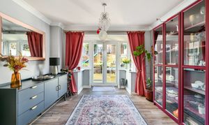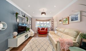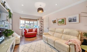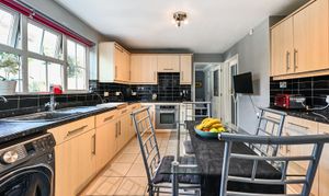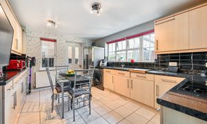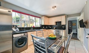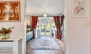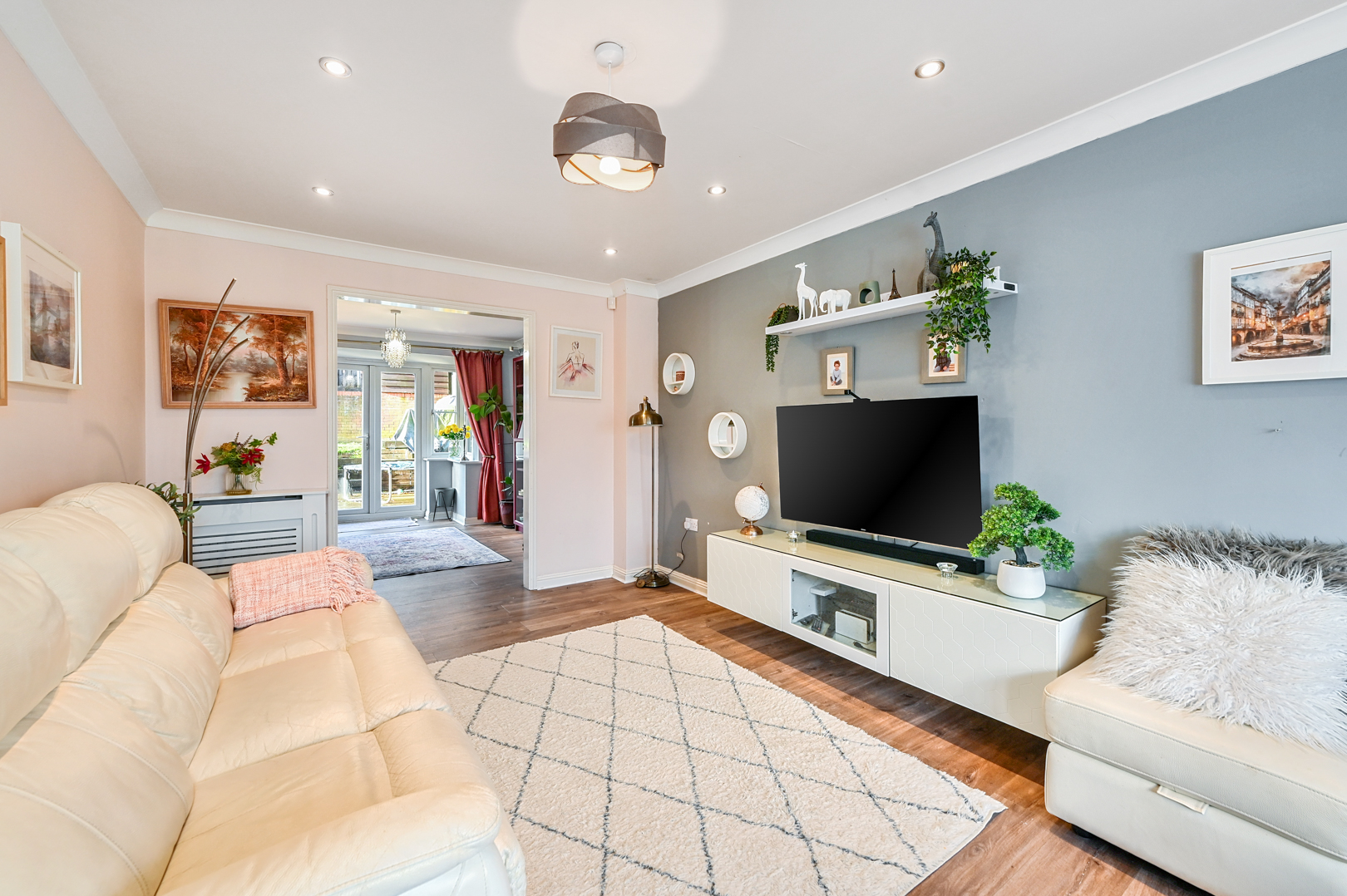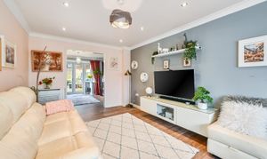 The dining room is a bright and versatile space, benefiting from a set of French doors that open directly onto the rear decking and garden. Twin side windows allow additional natural light to flow in, giving the room an open, airy feel. The room features wood-effect flooring, neutral décor, and a generous layout that comfortably accommodates a dining table or could be adapted for alternative uses such as a second reception area, child's playroom or home workspace.