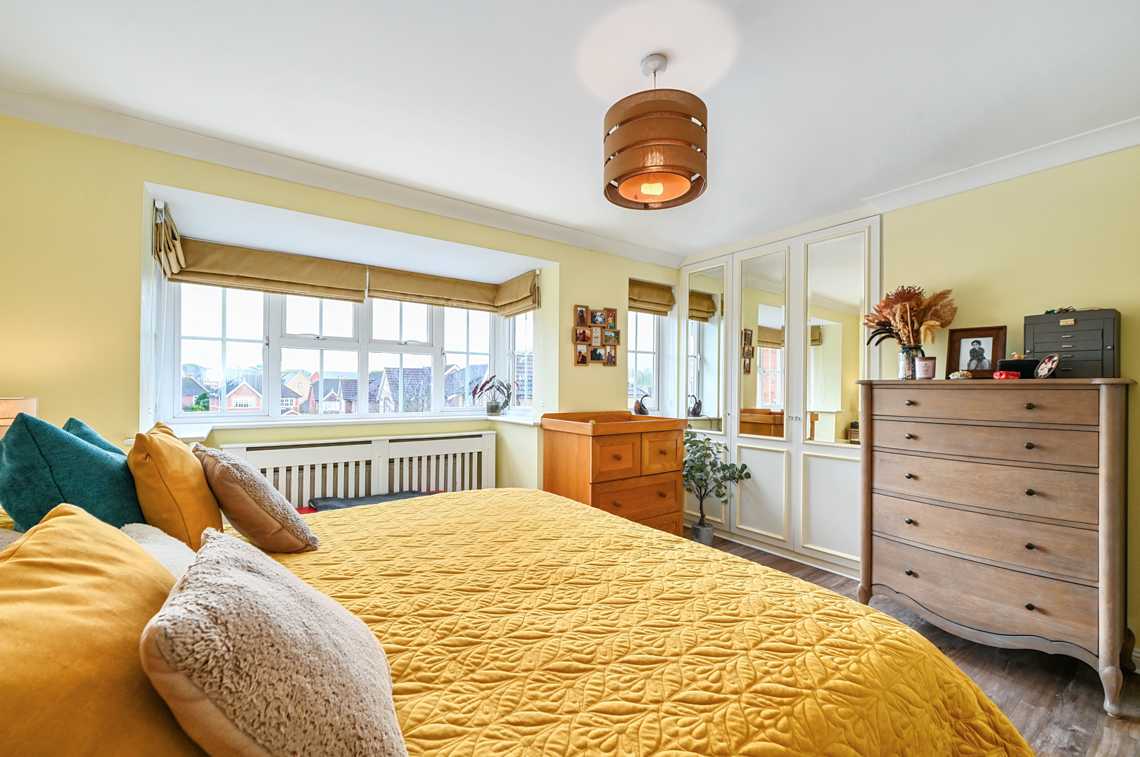 The master bedroom is a generous and bright space, enhanced by a large box bay window that provides an attractive outlook and plenty of natural light. The room offers ample floor space for bedroom furniture and includes fitted wardrobes along one wall, providing useful built-in storage. A door leads to the en-suite shower room, adding to the overall convenience of the main bedroom suite.