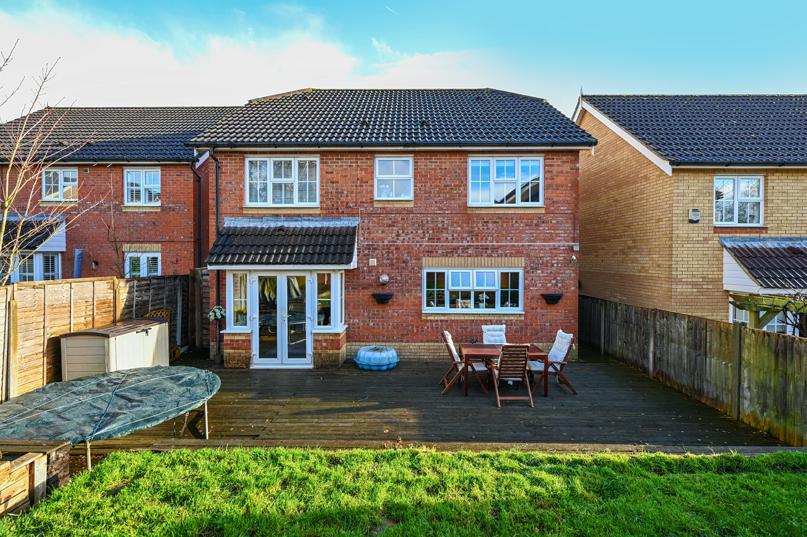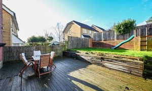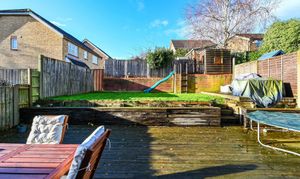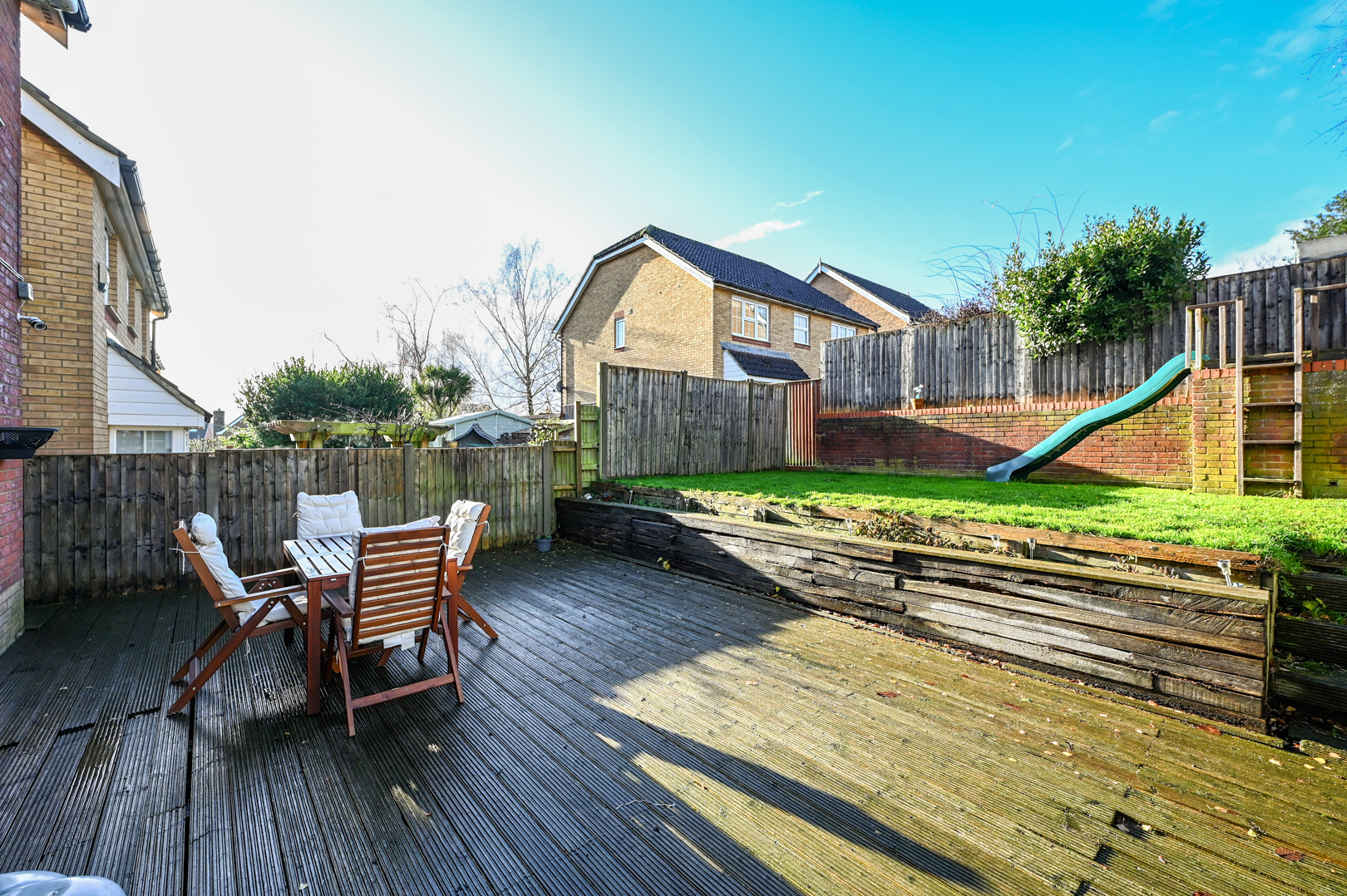 The rear garden offers a generous, family-friendly outdoor space arranged over two levels. The lower tier features a large decked area directly accessed from the house, providing ample room for outdoor seating, dining, and entertaining. Steps lead up to a raised lawned section, enclosed with fencing for privacy and including a children’s play slide and timber playhouse. The garden enjoys a good degree of sunlight throughout the day and offers plenty of scope for buyers to personalise the space to suit their needs.