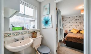 The Jack and Jill en-suite serves both rear bedrooms and includes a wash basin, WC and a separate shower enclosure (not pictured). A frosted window provides natural light and ventilation, while the connecting doors offer convenient access from each bedroom.