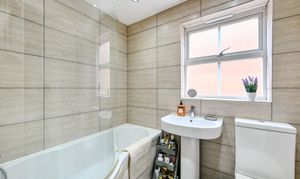The family bathroom is finished with modern large-format tiles and includes a P-shaped bath with a glazed shower screen, a pedestal wash basin and a close-coupled WC. A frosted window brings in natural light while maintaining privacy, and recessed ceiling spotlights add to the contemporary feel of the room.