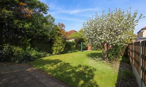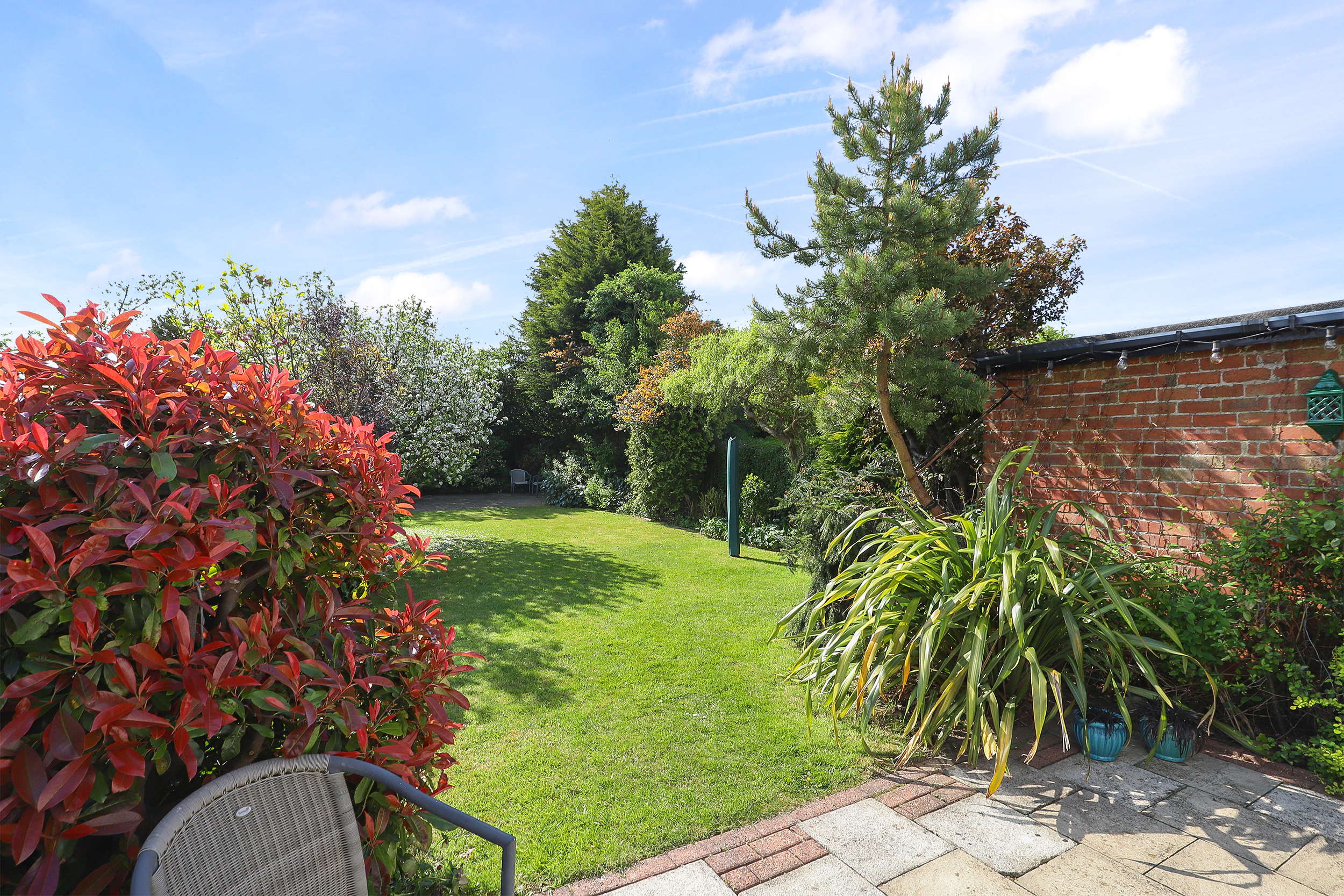 The beautifully landscaped rear garden features a stunning array of plants, flowers, and trees, all thoughtfully arranged to take advantage of its sunny south-facing position.