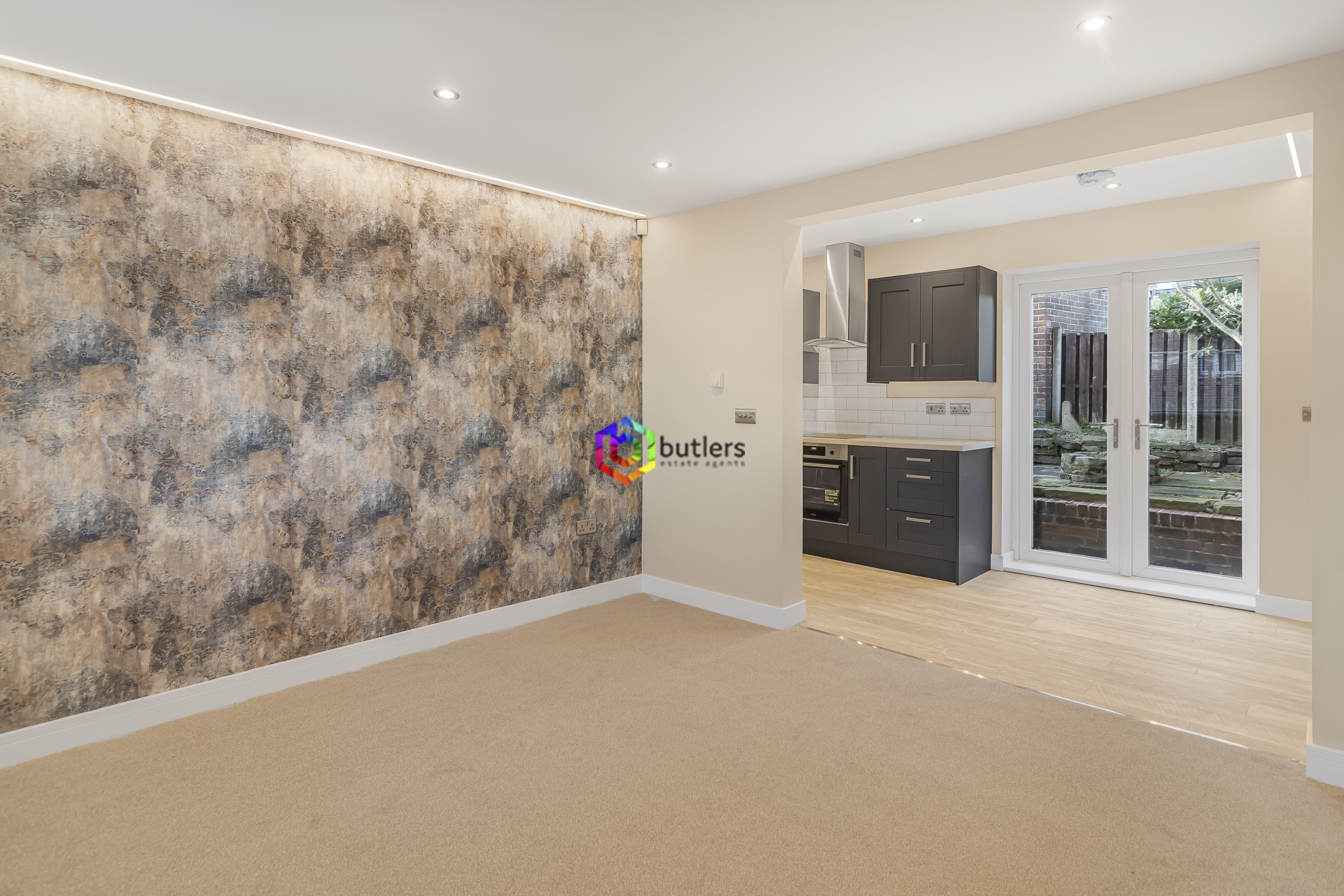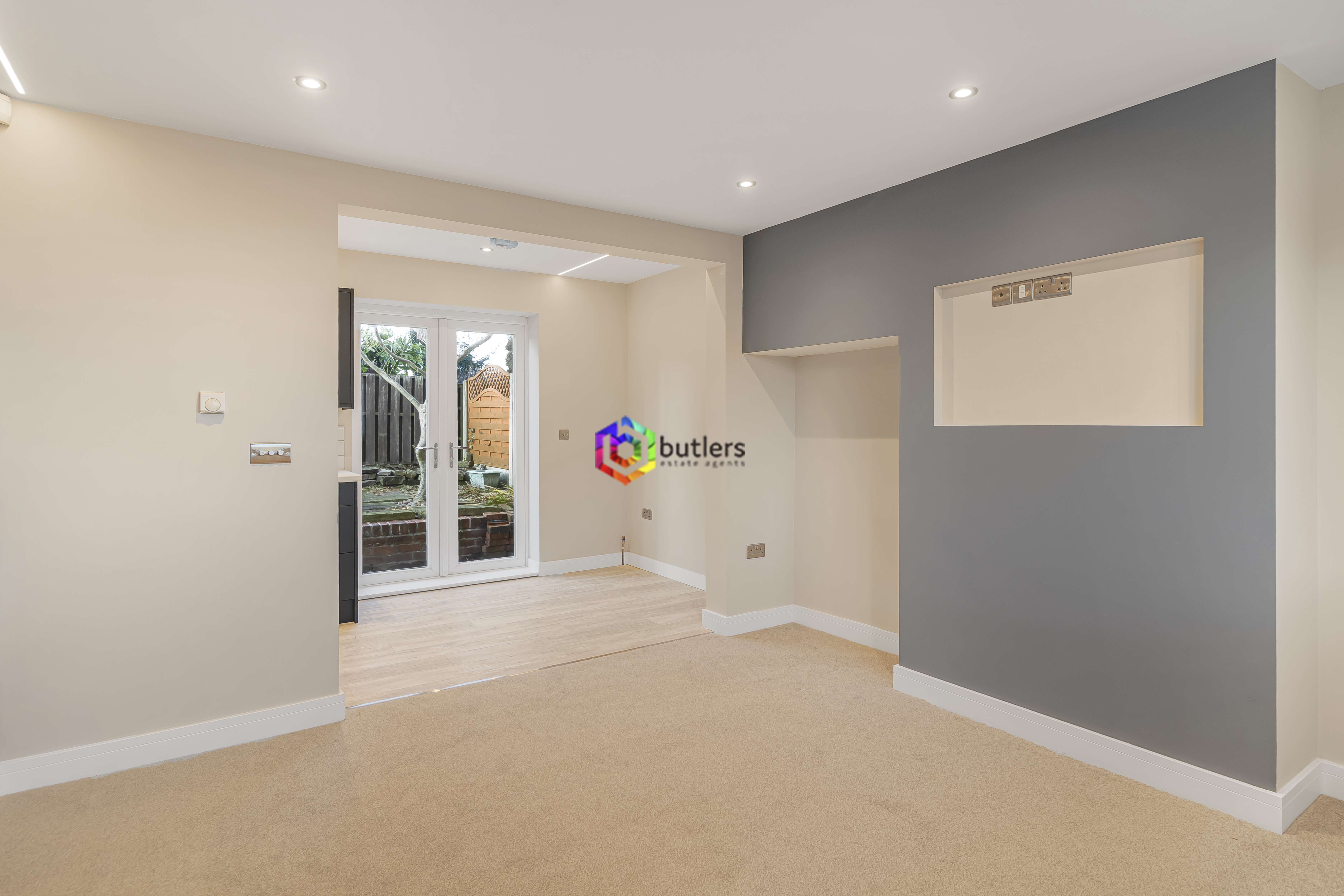 You will love this kitchen/dining space with its brand new modern blue kitchen with integrated oven, hob and extractor. There are spaces for two under counter appliances and the modern sink sits beneath the window overlooking the rear garden. Being open plan the space flows seemlessly to the dining area situated in front of the twin UPVC doors, plenty of room for a table and chair set for family times or entertaining.