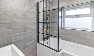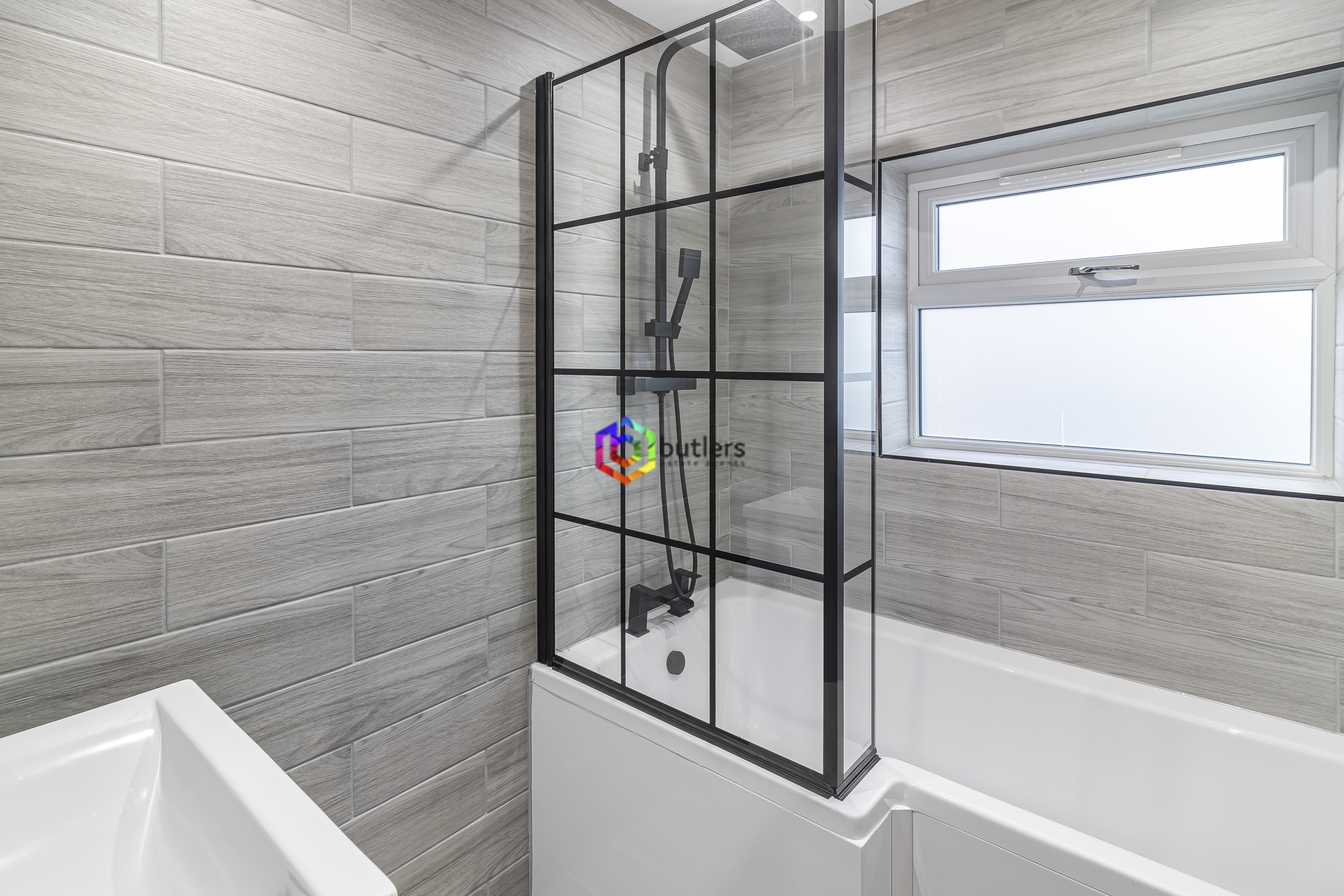 The bathroom is all brand new with its grey walls, white bath with modern black Georgian glazed shower screen and black taps plus shower. There is a modern rectangular sink on a vanity unit and a window to the rear.