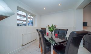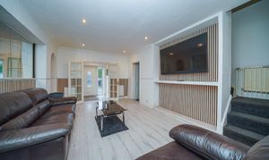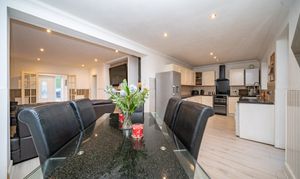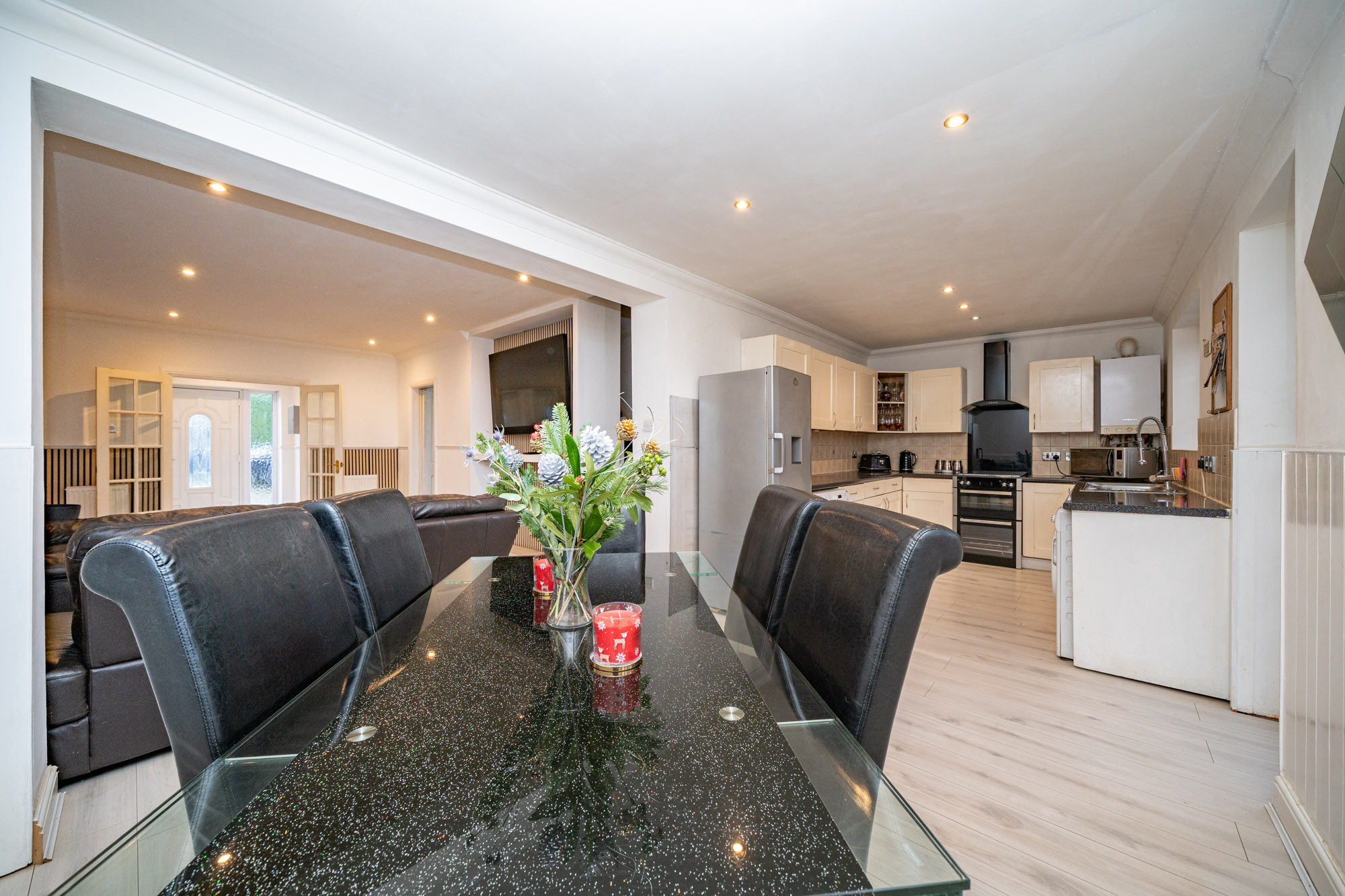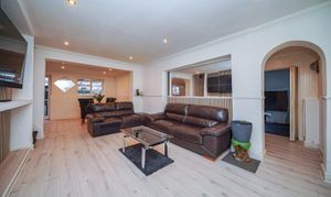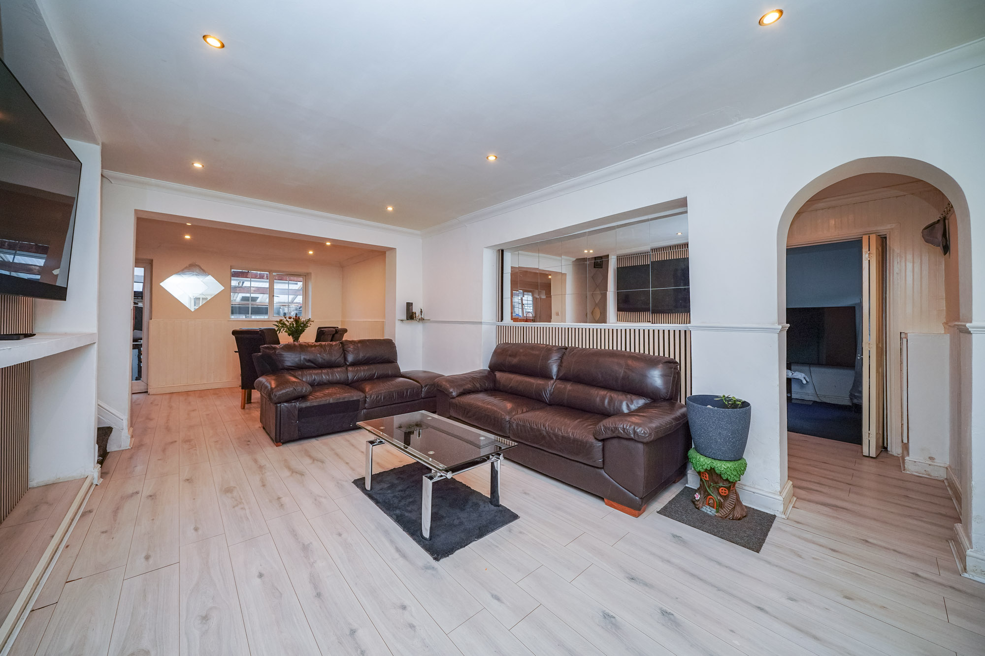 This impressive four-bedroom detached house offers versatile living space, ideal for families and those seeking a modern lifestyle. The property features a spacious open plan layout, seamlessly connecting the kitchen, dining, and living areas. The contemporary kitchen is equipped with integrated appliances, modern units, a double sink, and extensive countertop space, all illuminated by natural light from large windows and the doorway that provide direct access to the private, enclosed garden. The dining area is perfect for entertaining guests. The expansive living area boasts modern wood flooring, recessed lighting and a built-in TV feature, creating a welcoming environment for relaxation and social gatherings. Architectural features such as arched doorways and mirrored walls enhance the sense of space and light throughout.
