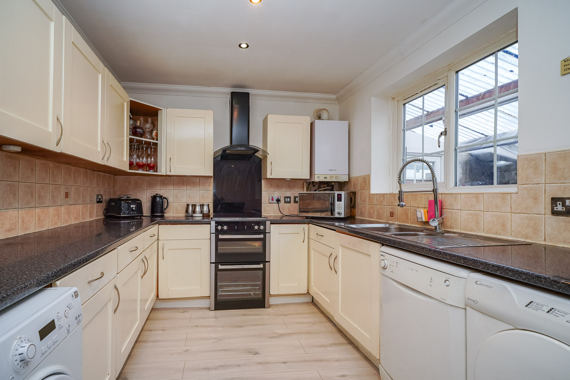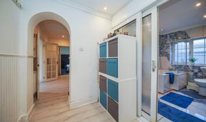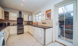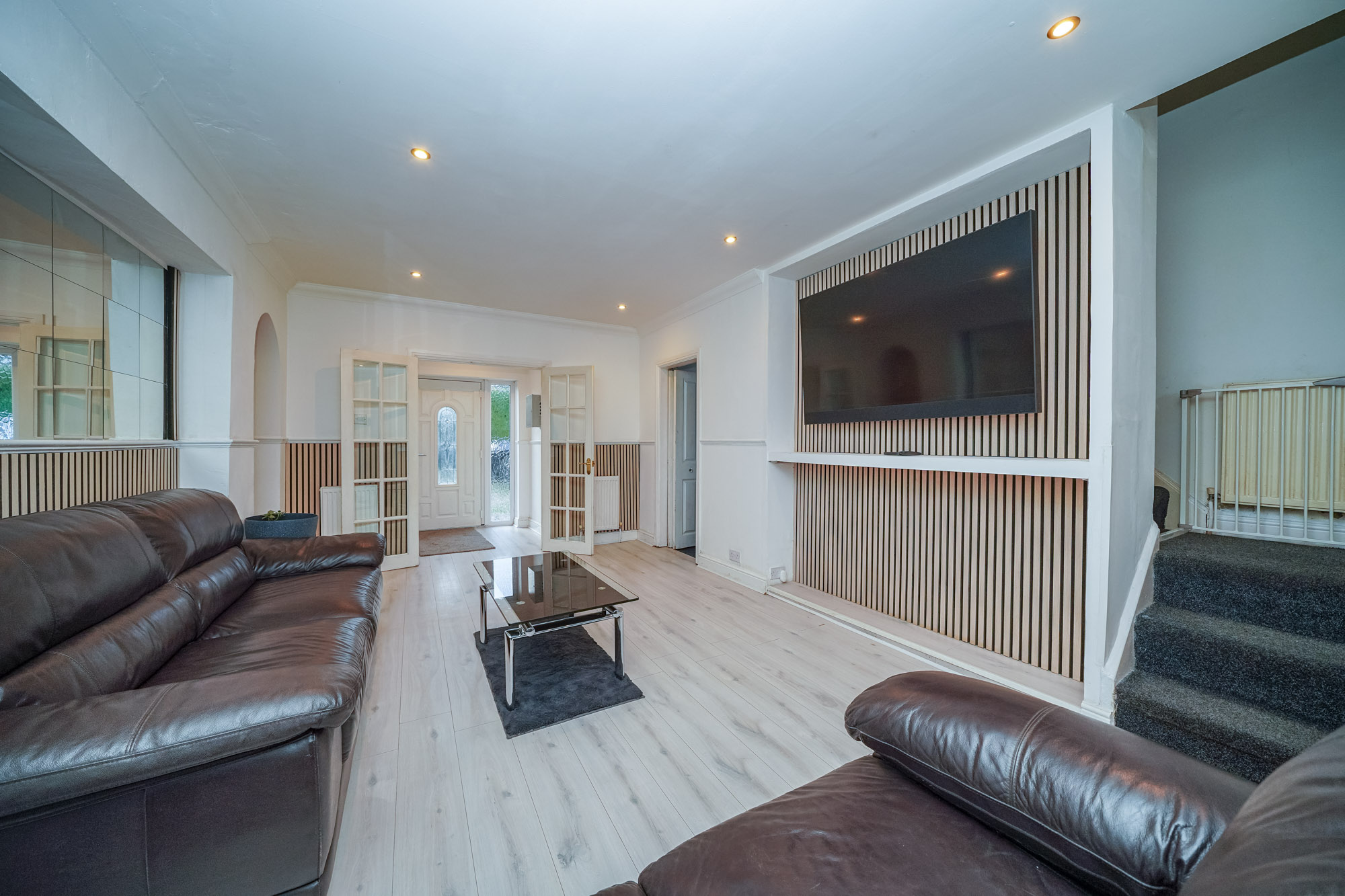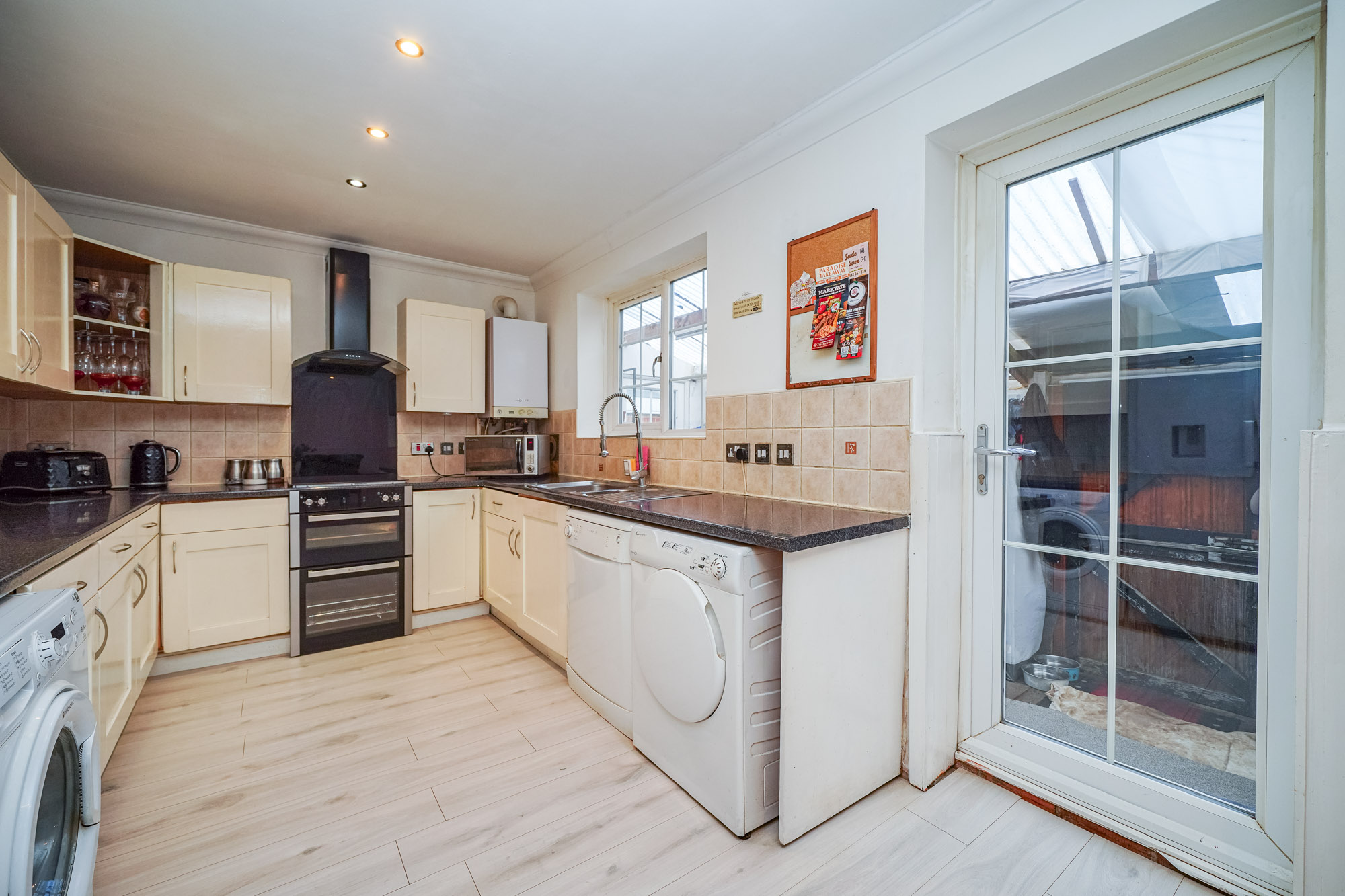This impressive four-bedroom detached house offers versatile living space, ideal for families and those seeking a modern lifestyle. The property features a spacious open plan layout, seamlessly connecting the kitchen, dining, and living areas. The contemporary kitchen is equipped with integrated appliances, modern units, a double sink, and extensive countertop space, all illuminated by natural light from large windows and the doorway that provide direct access to the private, enclosed garden. The dining area is perfect for entertaining guests. The expansive living area boasts modern wood flooring, recessed lighting and a built-in TV feature, creating a welcoming environment for relaxation and social gatherings. Architectural features such as arched doorways and mirrored walls enhance the sense of space and light throughout.