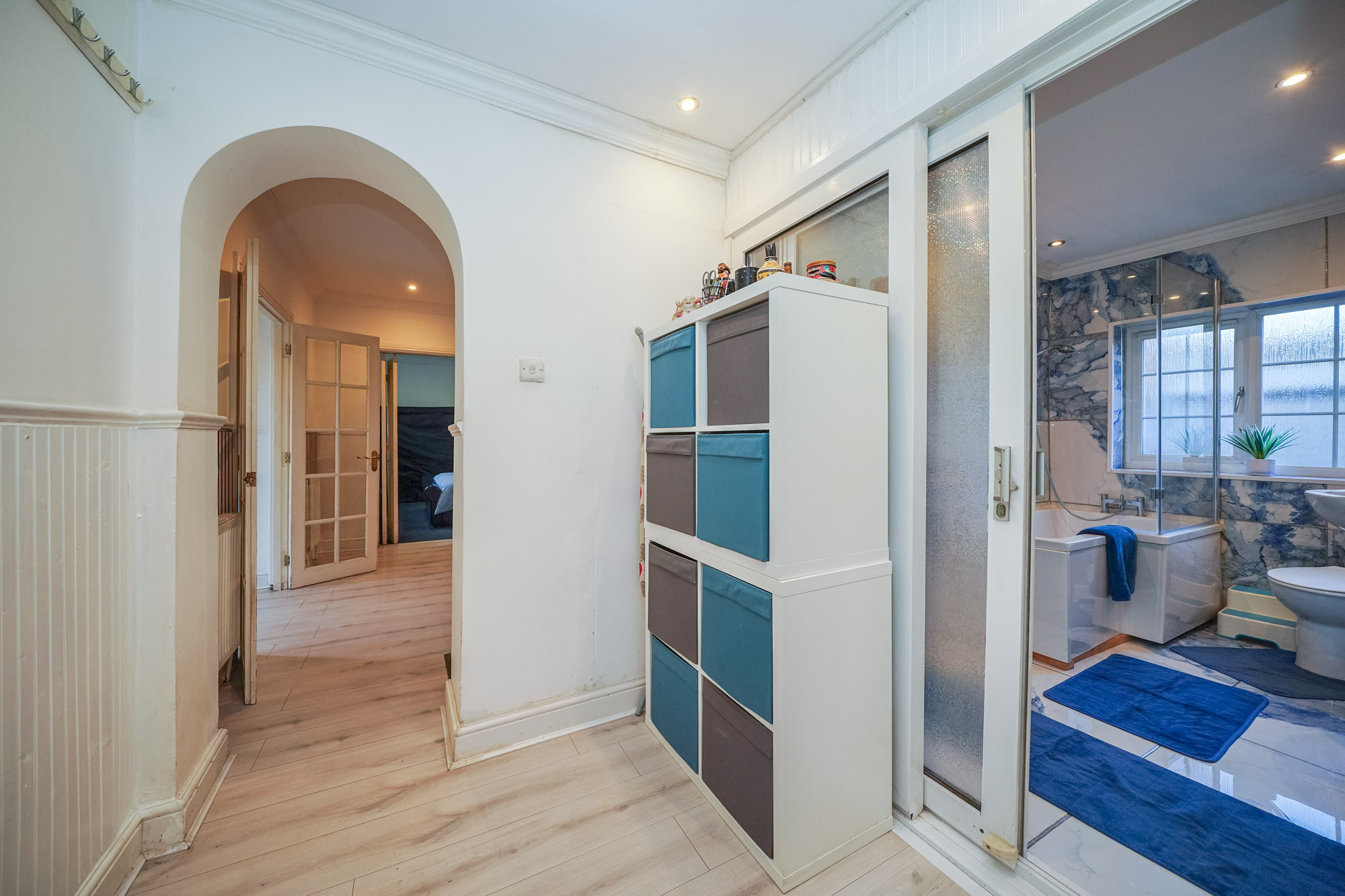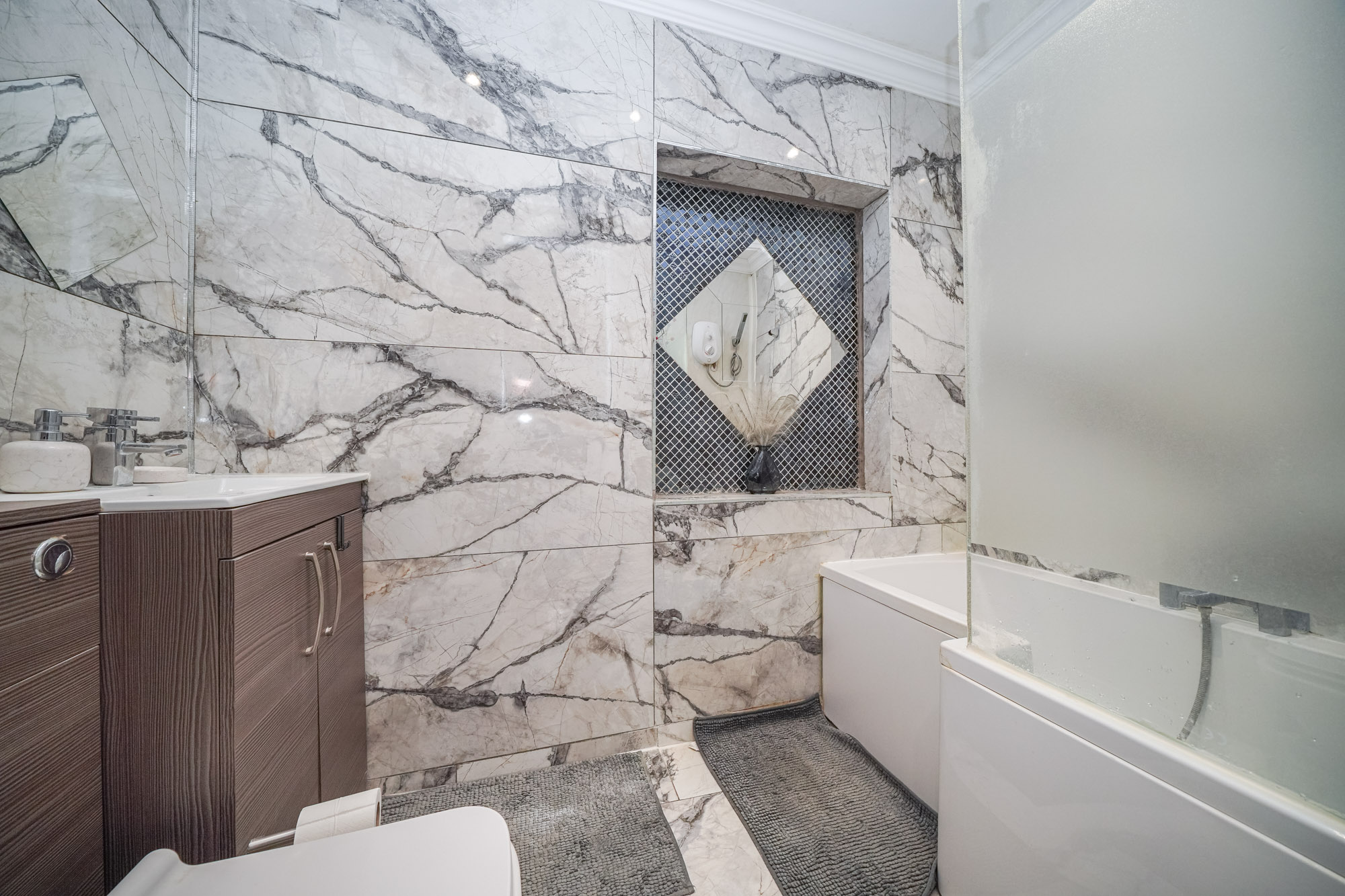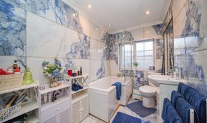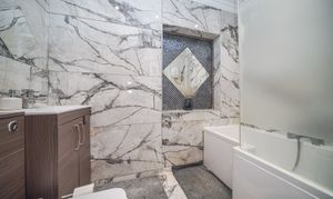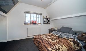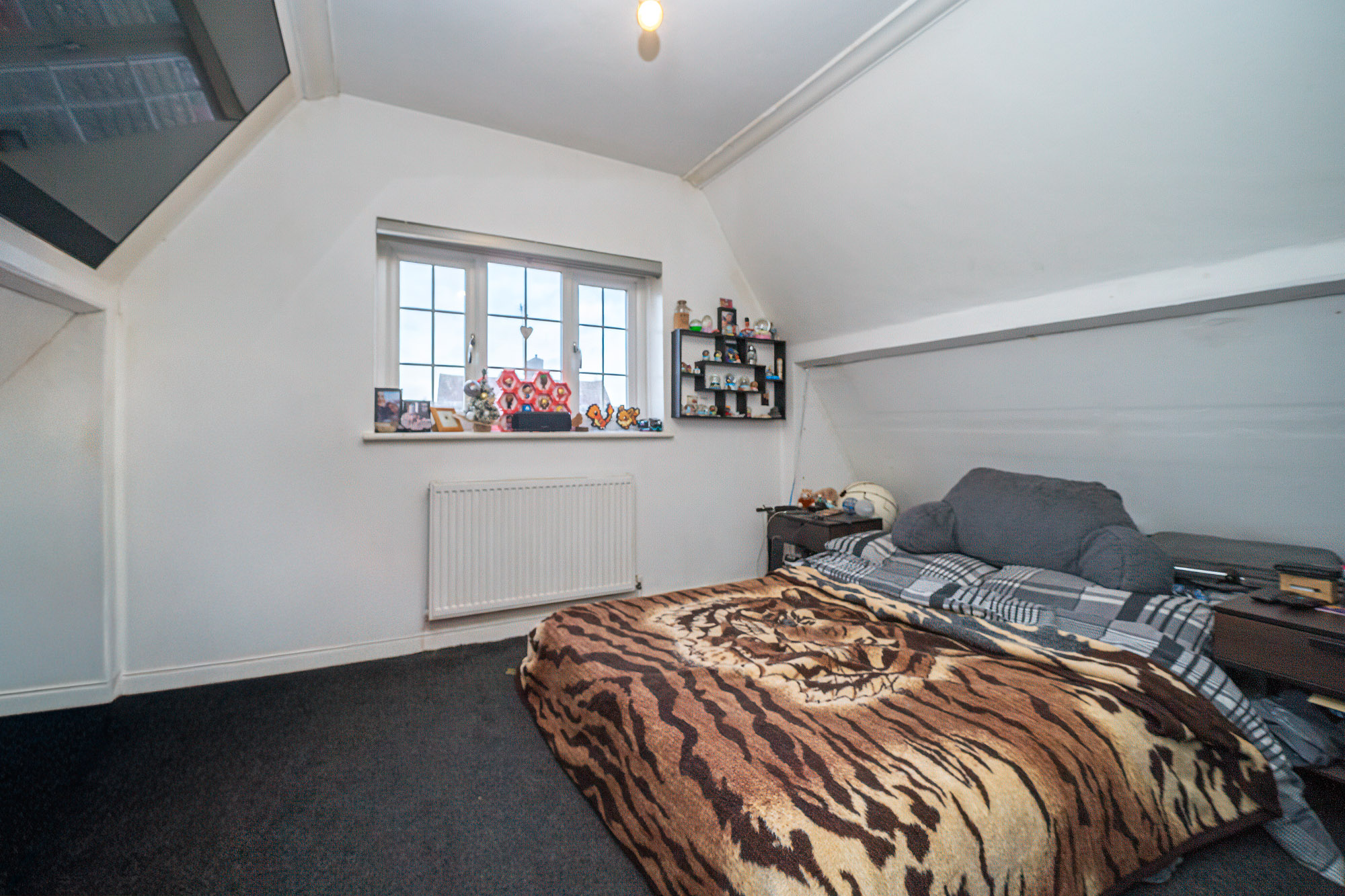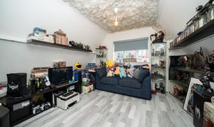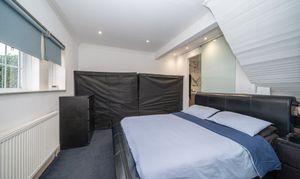The property’s four bedrooms are thoughtfully designed for comfort and practicality. The main bedroom benefits from built-in lighting, large windows, and direct en-suite access via a modern glass door, providing a private retreat. Additional bedrooms include a charming attic room with a dormer window and radiator heating, as well as a versatile room with bunk beds and a wall-mounted TV, ideal for families or guests. The modern family bathroom and additional en-suite feature luxurious marble-style tiling, frosted glass elements, a contemporary tub, and ample storage, blending style with functionality.
