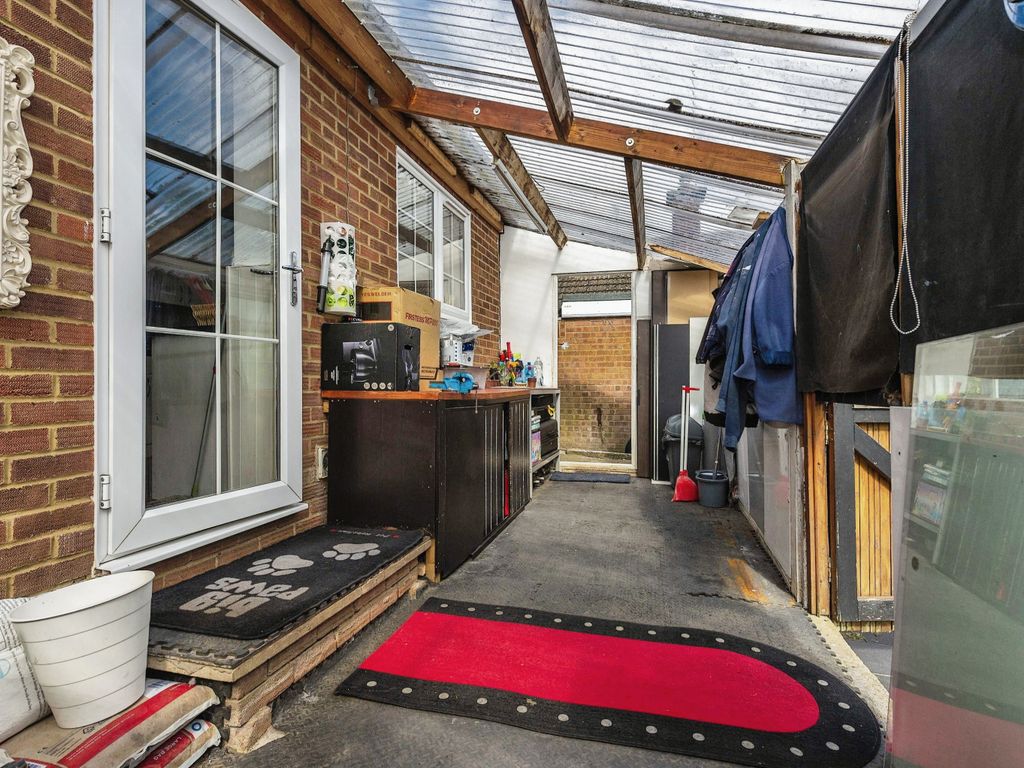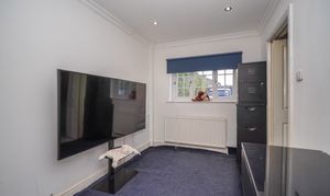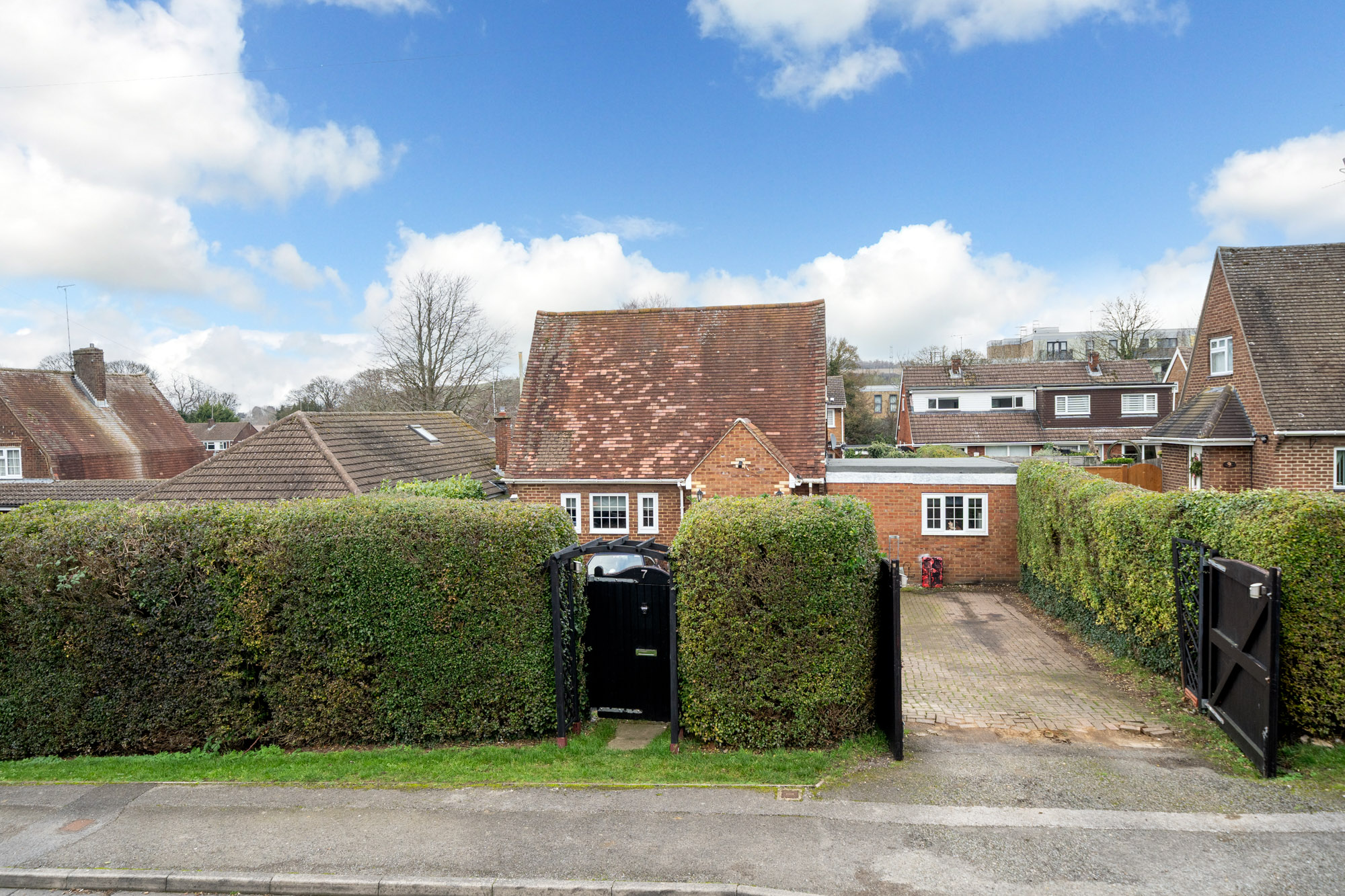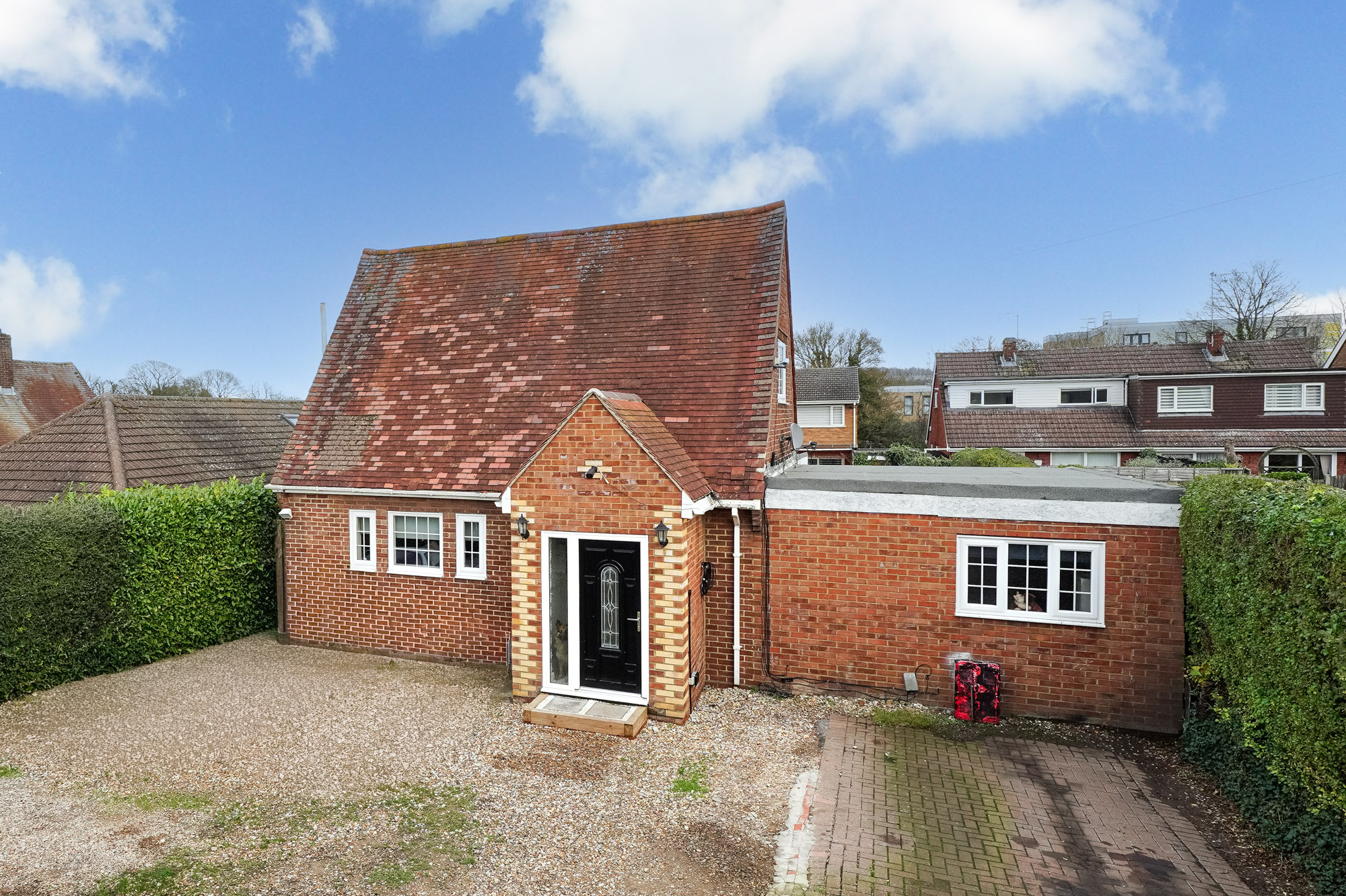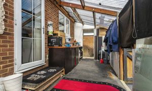 Further highlights include a spacious lean-to area, perfect for extension potential in the future (subject to planning), and ample shelving throughout for organised storage. The property’s exterior impresses with a charming brick façade, traditional pitched roof, and a gated, gravel driveway offering secure off-road parking for multiple vehicles. Mature hedges and a private, enclosed front garden ensure privacy and tranquillity, making this home especially appealing for those seeking a secluded yet welcoming environment.