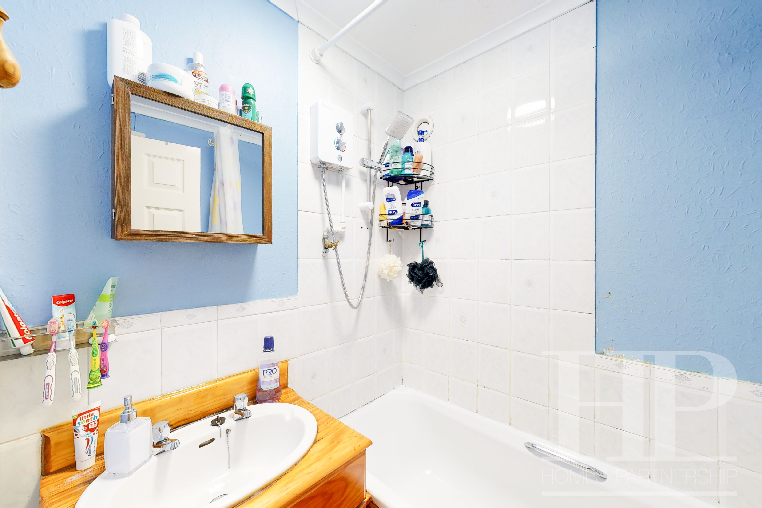 Fitted with a white suite comprising a bath with shower over and a wash hand basin with vanity cupboard below. Extractor fan.
