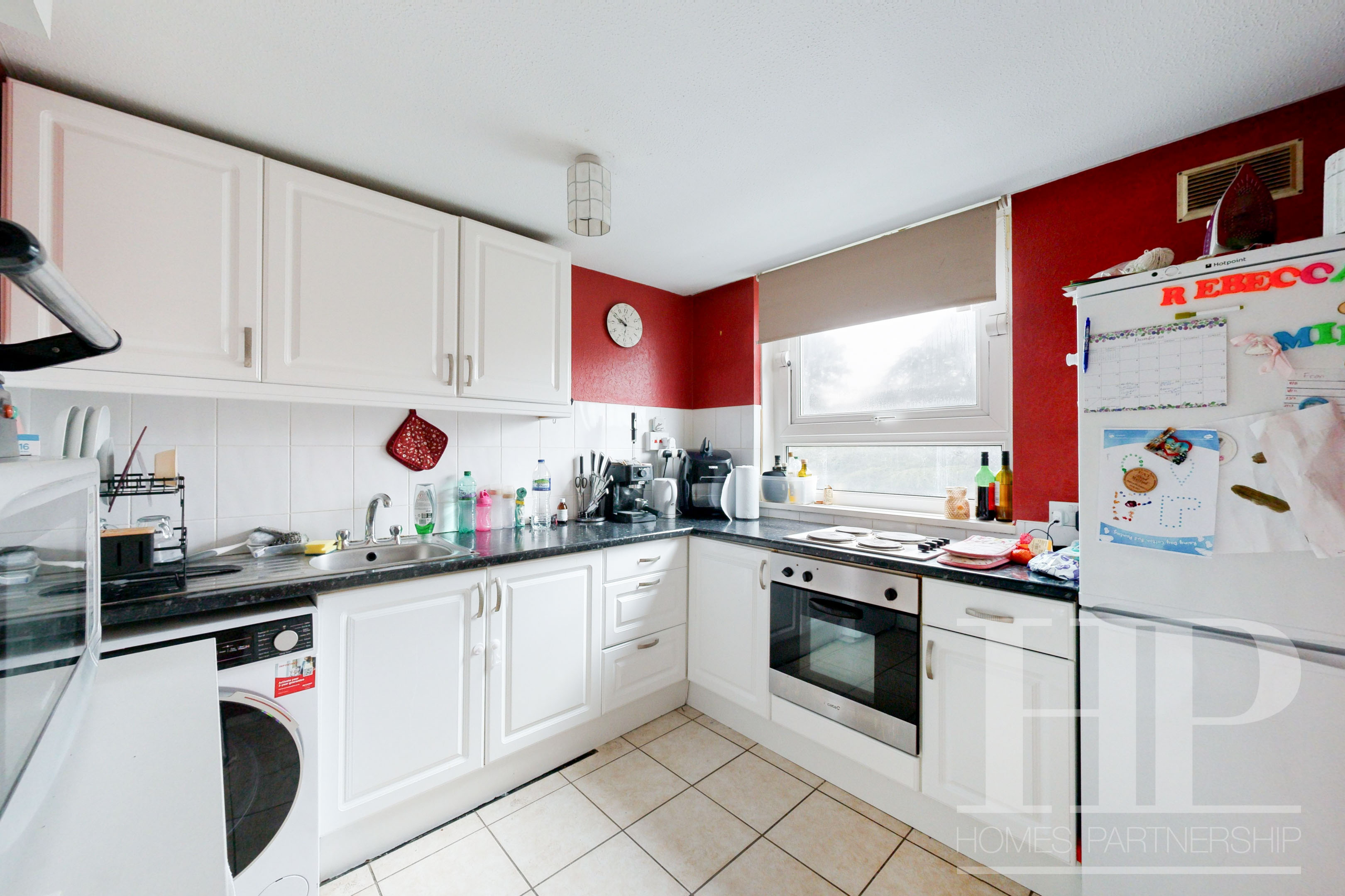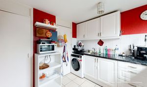 Fitted with a range of wall and base level units incorporating a single bowl, single drainer, stainless steel sink unit with mixer tap. Built in oven and hob. Fridge / freezer and washing machine. Two storage cupboards. Window.