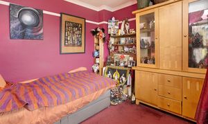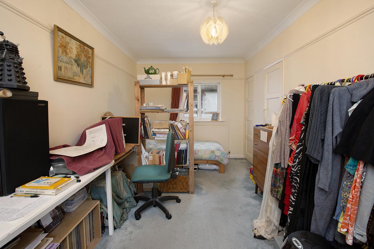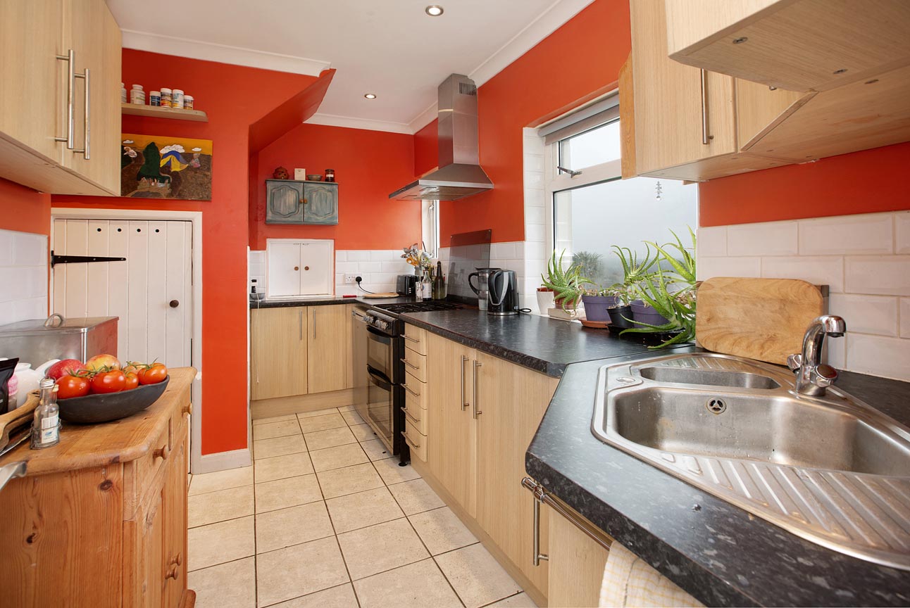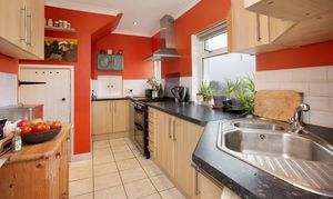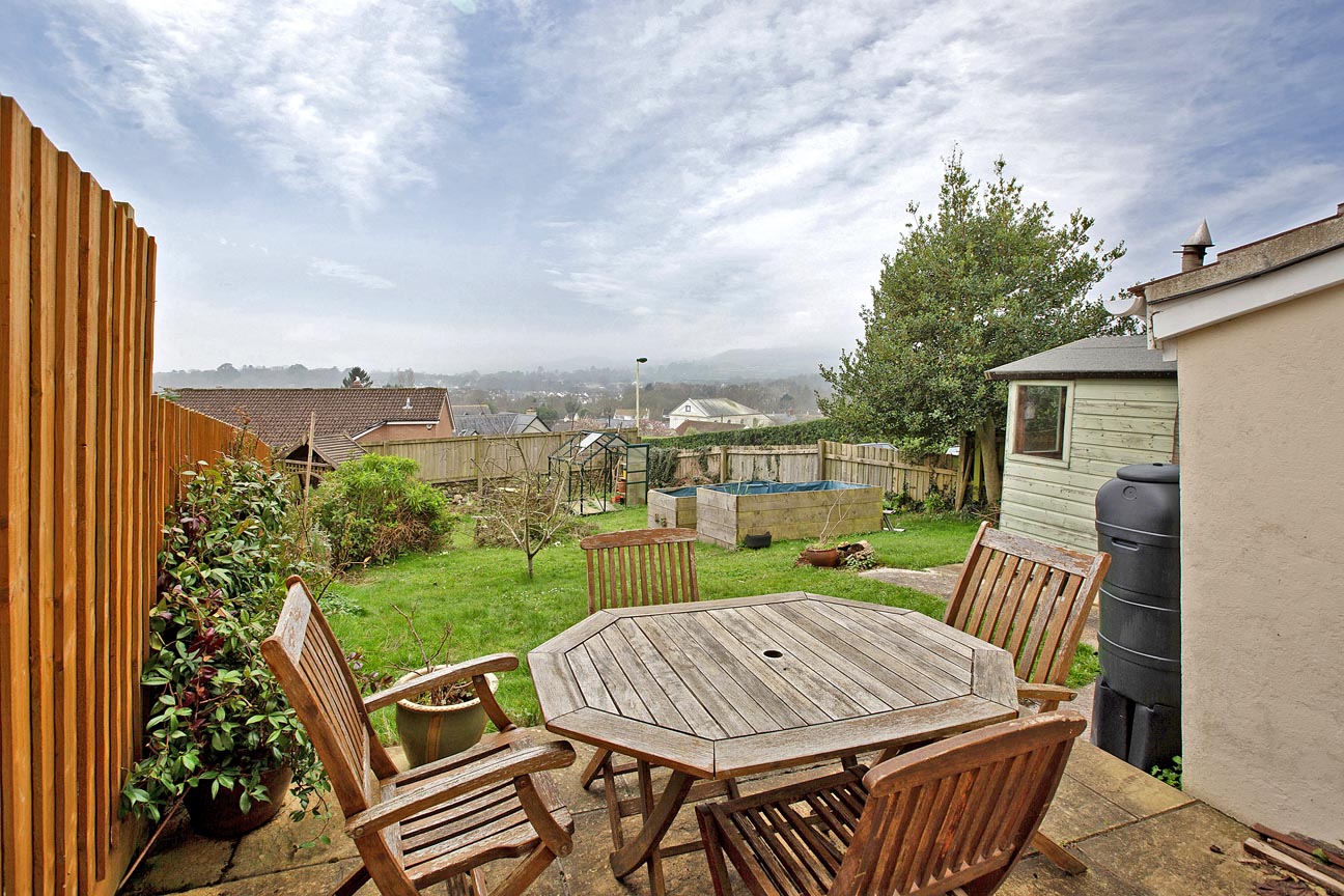 Upstairs, the principal bedroom is a generous double, currently arranged as a home office/bedroom. This dual-aspect room benefits from excellent natural light and features two useful cupboards over the stairs, ideal for additional storage or a laundry space. The second bedroom is another well-proportioned double, complete with a bay window, feature fireplace and housing the boiler cupboard. The third bedroom is a good-sized single room, enjoying elevated views across Bovey Tracey and an abundance of natural light. From the rear garden, a door leads into the utility room, which benefits from light and power and currently accommodates a freezer and washing machine. From the utility room there is a door down to the cellar which houses further storage and an infrared sauna room – a unique and desirable feature.