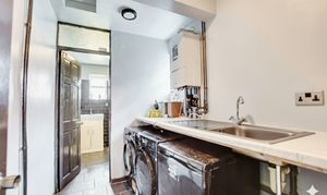 With stainless steel sink and drainer unit, work surface, plumbing for washing machine, wall mounted boiler, tiled floor.