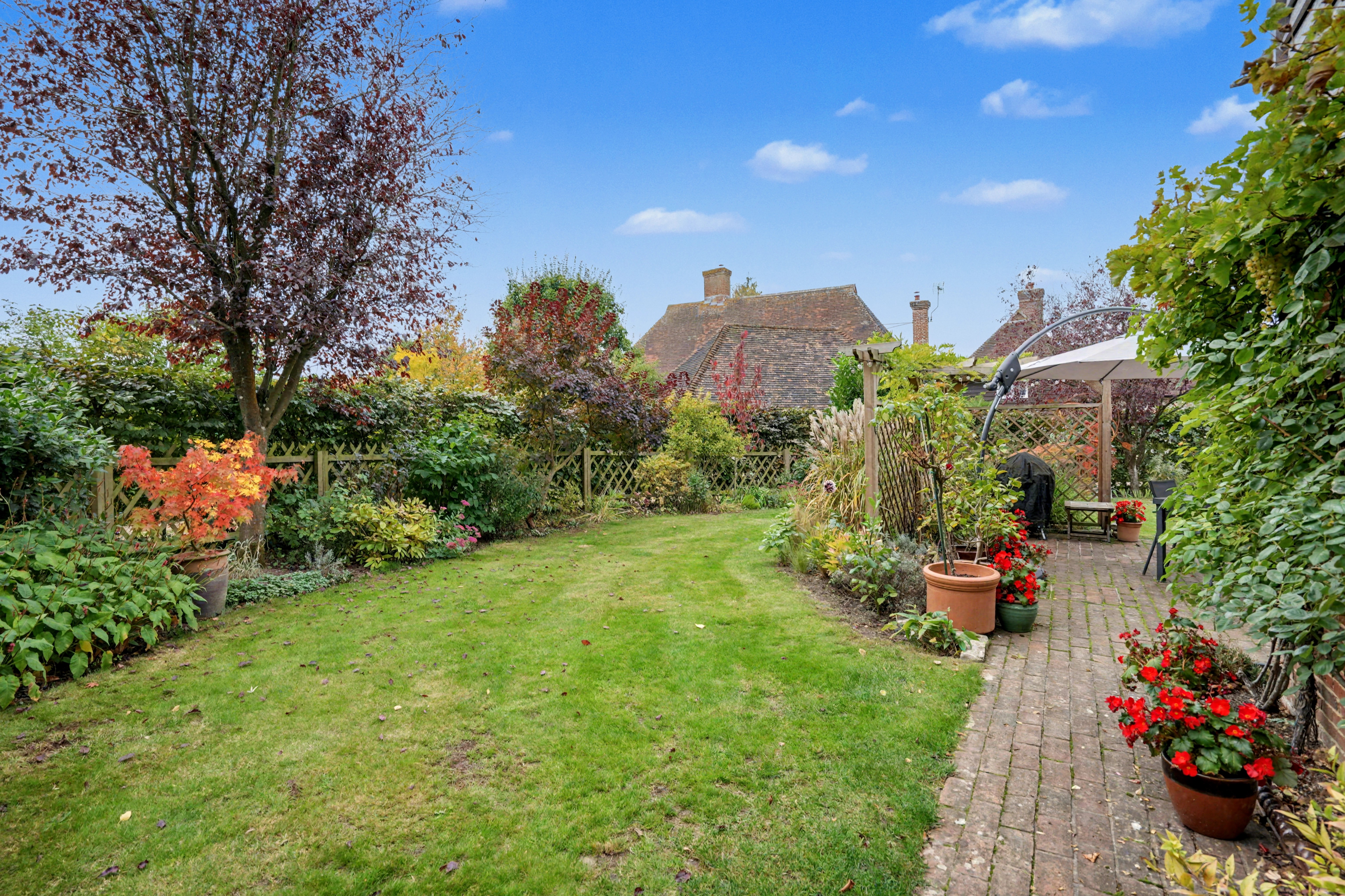 The plot extends to around 0.28 acres, yet what makes this home truly special is the use of an exclusive further third of an acre by way of a formal lease agreement — land that once formed the original village green, held in trust to protect and preserve it for future generations. To stand on this ground is to feel the continuity of Hollingbourne’s story: a place where medieval villagers once gathered, now your private landscape framed by church walls, historic buildings, and the rolling hills of the Kent Downs National Landscape. All in, this brings the total plot to just shy of two-thirds of an acre.