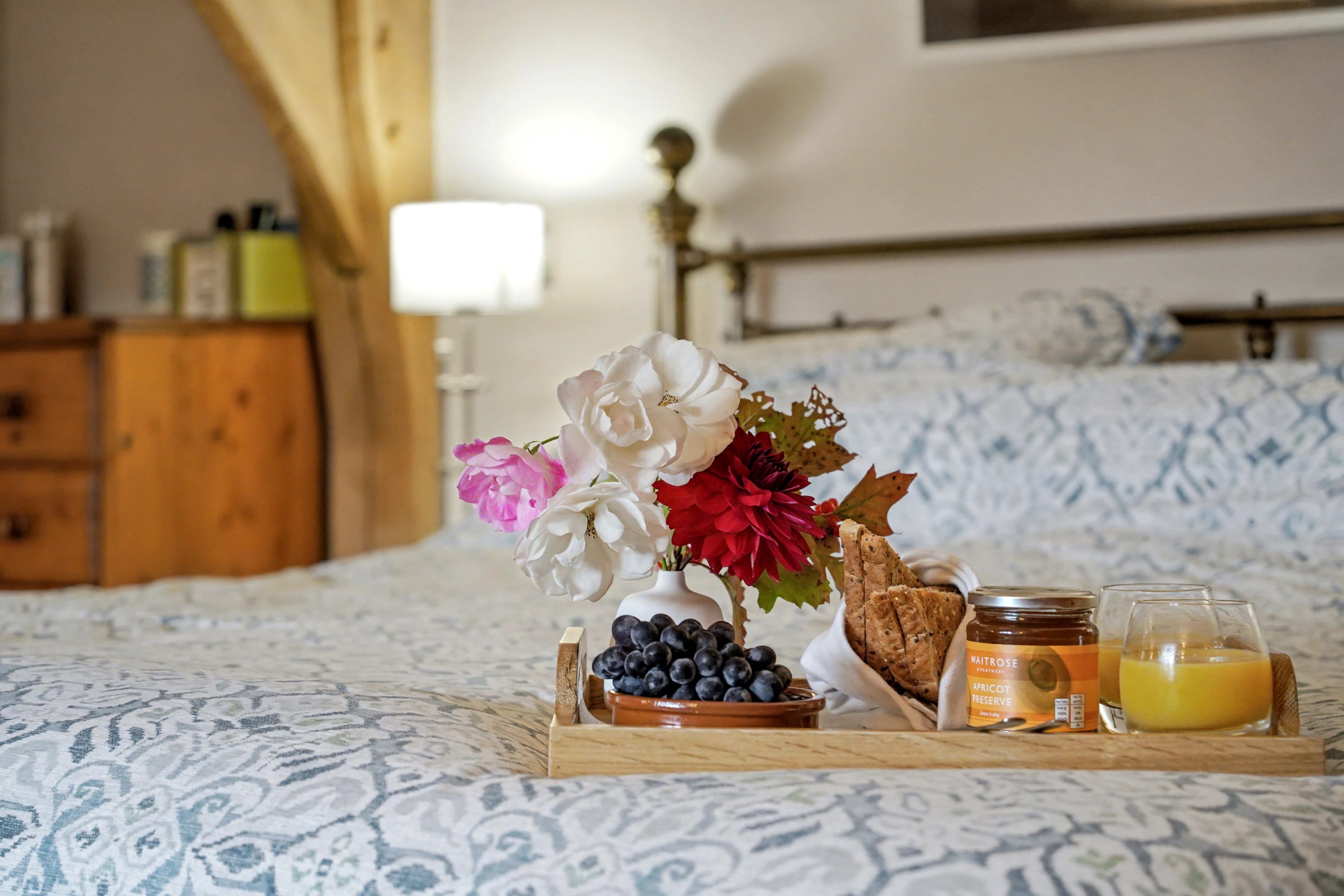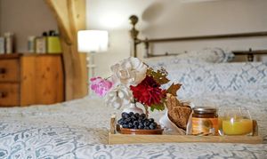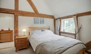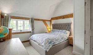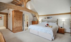 The accommodation unfolds with a natural, organic flow that feels shaped by history rather than design. Rooms open to one another with an easy grace, each space warm and textured — a sitting room anchored by a grand inglenook fireplace, a country kitchen with views of the gardens, and bedrooms where exposed trusses sweep high into vaulted ceilings, their leaded windows framing soft hints of the landscape beyond.