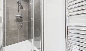 Tiled flooring, three piece in white comprising of wc, basin, shower enclosure with mains fed shower, tiled splashbacks, towel radiator