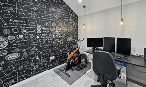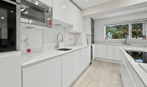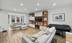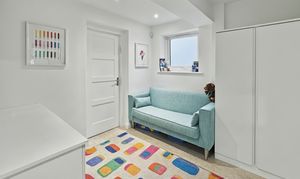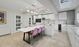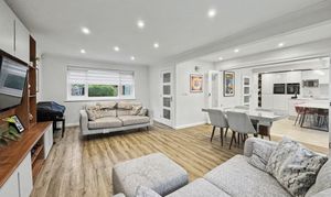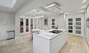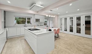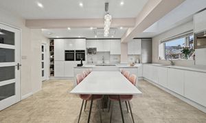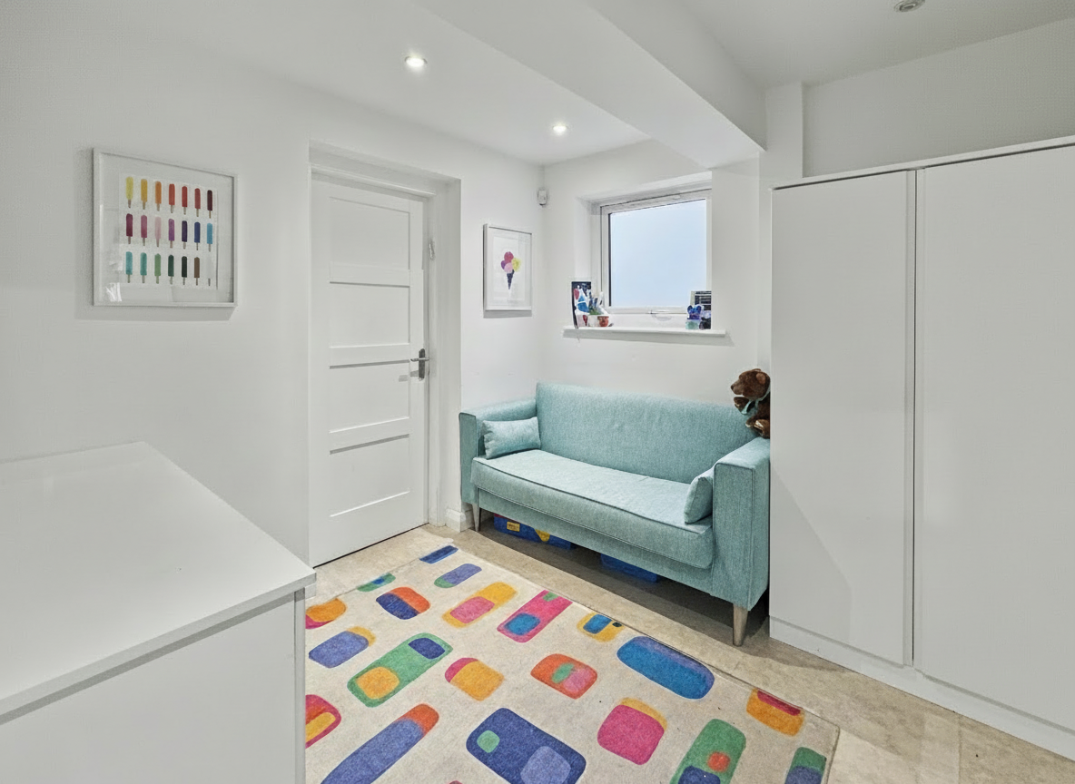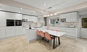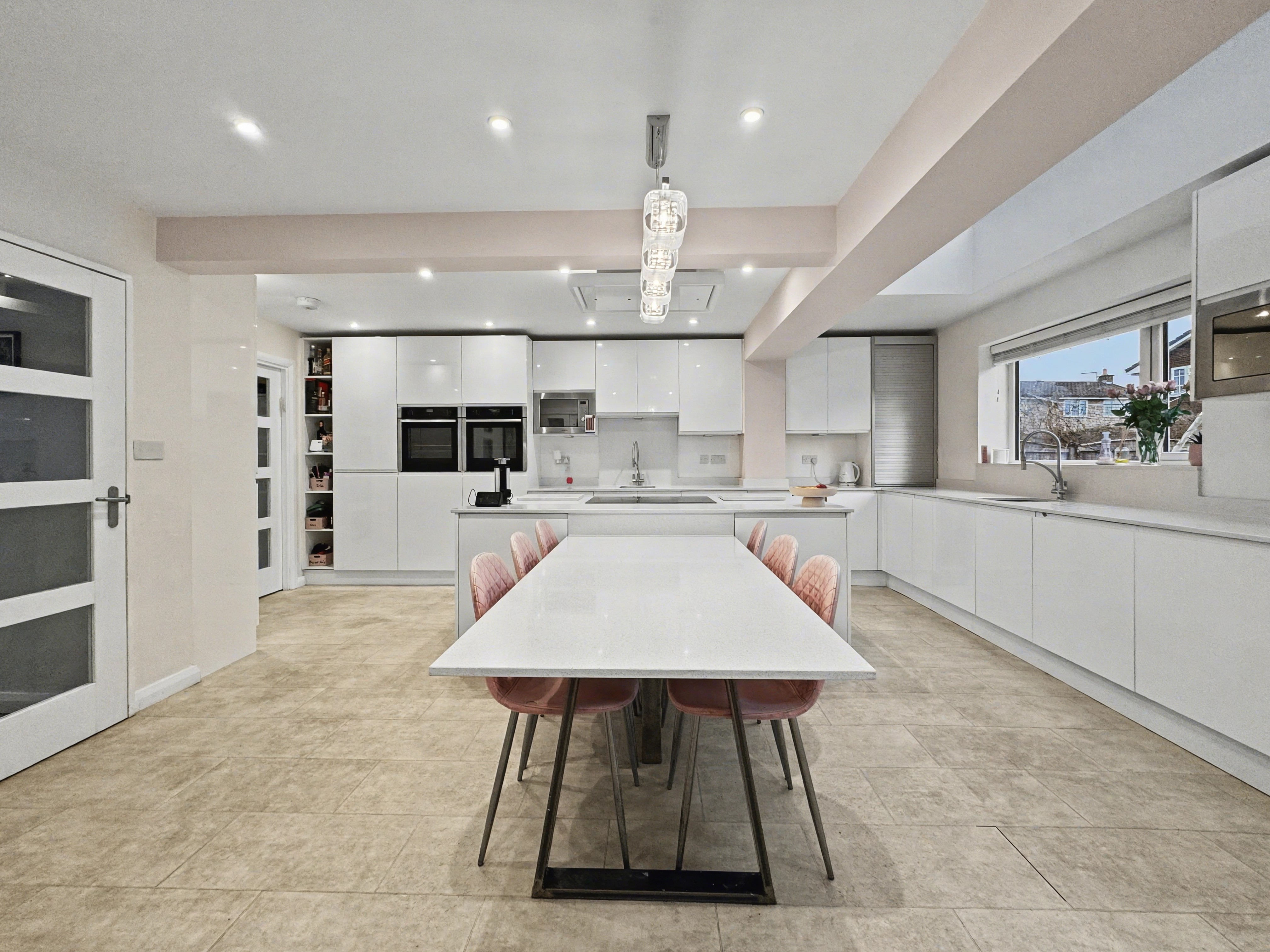 A further playroom sits just off the hall, complete with an adjoining utility room. The heart of the home is the impressive open-plan kitchen and dining area, designed with modern living in mind. A central island, skylights and large windows draw in an abundance of natural light, while plentiful storage and stylish finishes create a space ideal for both everyday use and entertaining. Sliding doors lead through to a bright lounge that enjoys views of both the front and rear, with the option to open the space fully for larger gatherings.